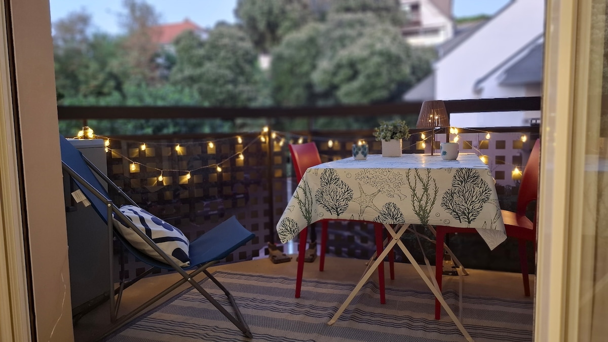 Appart de 40m2 lumineux, bien équipé avec une bonne literie. Au 3ème et dernier étage (avec ascenseur) son calme est idéal pour le TAD avec la fibre. Balcon sans rue passante au pied avec table + 4 chaises. Une vue agréable sur les toits, l'église, et un peu sur la mer. Situé à 200m, du centre des Pins, du marché, du remblai. Place privée sécurisée par barrière. A disposition: draps, serviettes, jeux de société, cafés, thé. Info : le ménage n'est pas inclus, merci de rendre l'appartement propre.