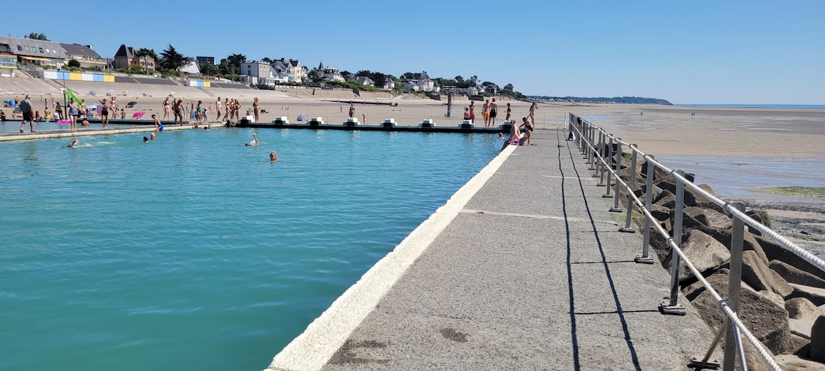 À 200 m d'une belle plage de sable fin À 10 mns de Granville et 30 mns du Mont Saint Michel Une belle digue pour rejoindre Jullouville à pieds Accueil 4 personnes, les draps et serviettes sont fournis. Les animaux sont acceptés à condition de leur prévoir leur tapis ou panier .Chambre à l'étage et canapé BZ au Rez de chaussée. Commerce et laverie à proximité