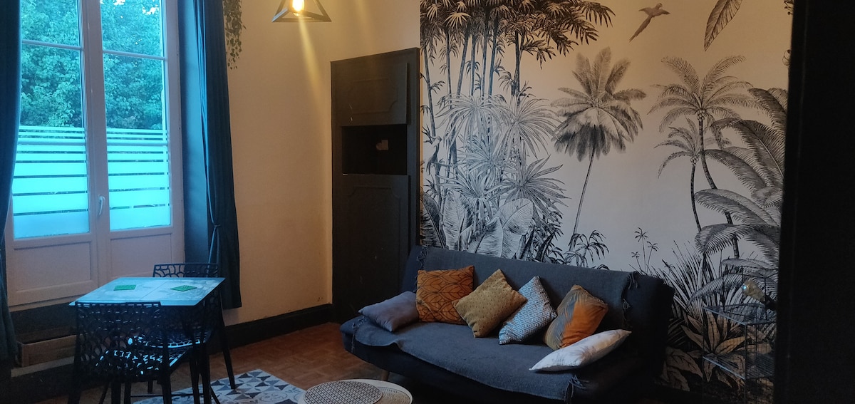 T2 de 64 m², climatisé à 200 mètres à pied du centre-ville. À 1 km de la voie verte, toutes commodités. Airbnb classé ( pas d'ouverture dans la pièce principale) se compose d'une chambre (velux)+clim avec un lit 160 et un lit bébé. Un salon-séjour avec un canapé lit et un lit de 90. Une salle d'eau WC, une cuisine ouverte, stationnement gratuit dans la rue, garage sous le Airbnb pour vélos et motos. Accès à la cours pour manger, fumer et se détendre. Le Wi-Fi est disponible sans supplément.