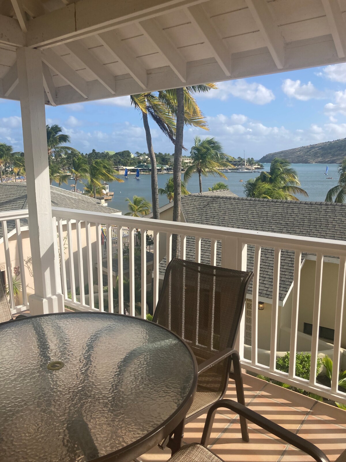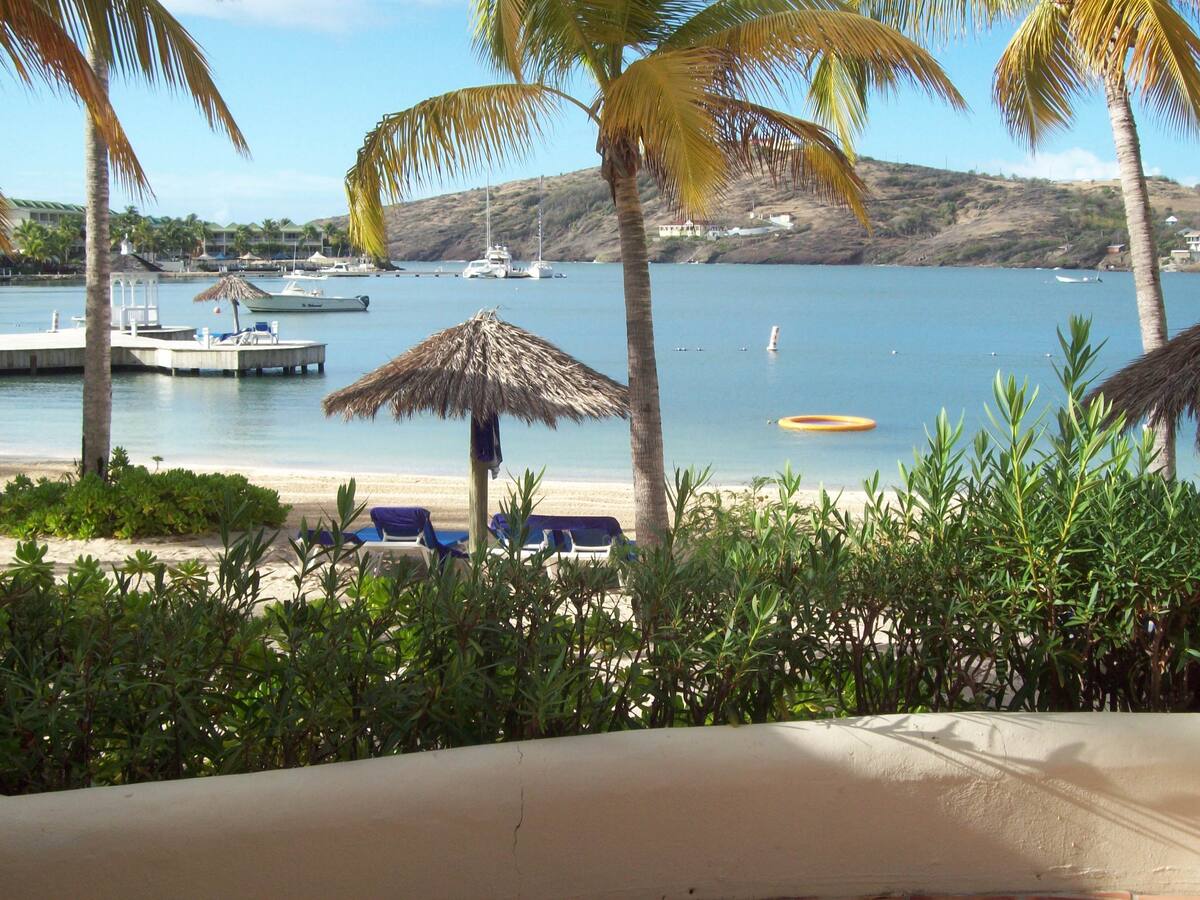 Cozy beachfront apt at Dieppe Bay Villas, Falmouth Harbour. King bed sleeps 2-3 with AC in bedroom, living room & kitchen. Comfy sleeper sofa sleeps 2. Full kitchen: espresso & coffee makers. Smart TV, fast Wi-Fi, washer/dryer, huge ocean-view balcony, ample closets. Private beach access with snorkel gear, paddleboard; bikes on request (small fee). Partnered with Dojo On The Wave Charters for savings on nearby sailing/powerboat trips. Updated & perfect for small Families couples/small groups!