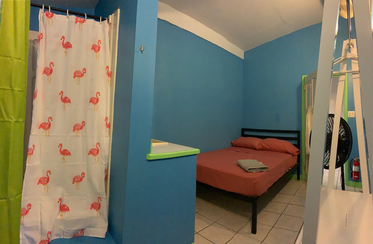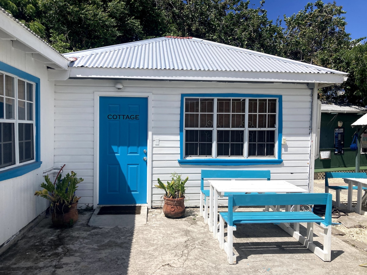 Private, West Indian, stand alone hut with view of Superyacht Marina and Falmouth Harbour in gated community belonging to Libby Nicholson on grounds of Pineapple House overlooking the Antigua Yacht Club and Falmouth Harbour in English Harbour, Antigua. We are a backpacker hostel, but this is our most private hut. Although best for one, the bed is a Full, so a couple can be accommodated. Mosquito net, fan, picture window, shares kitchen & bathroom with shower. Available by the month Oct-Aug.