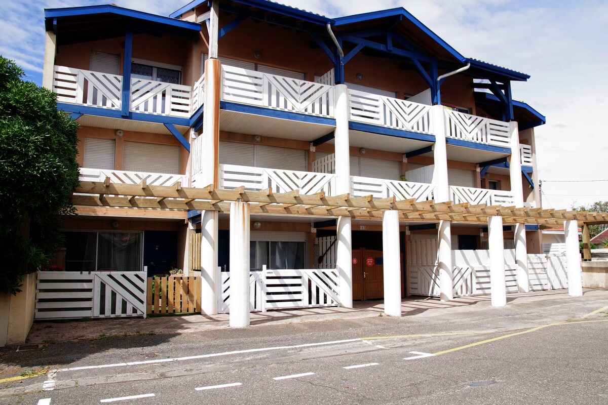 Appartement de 35 m2 à 300 mètres de la plage principale au calme + balcon de 9 m2 exposé Sud + local à vélos. Au pied de l 'océan, des forêts, des pistes cyclabes et des commerces …. Place de parking privée. Chambre séparée du salon par un rideau comprenant 1 lit double. Salon ouvert sur le coin cuisine toute équipée avec un canapé lit, Tv , ventilateur, penderie. WC séparé, salle de bain avec baignoire équipée d'une machine à laver. Balcon avec table et chaises. WIFI inclu