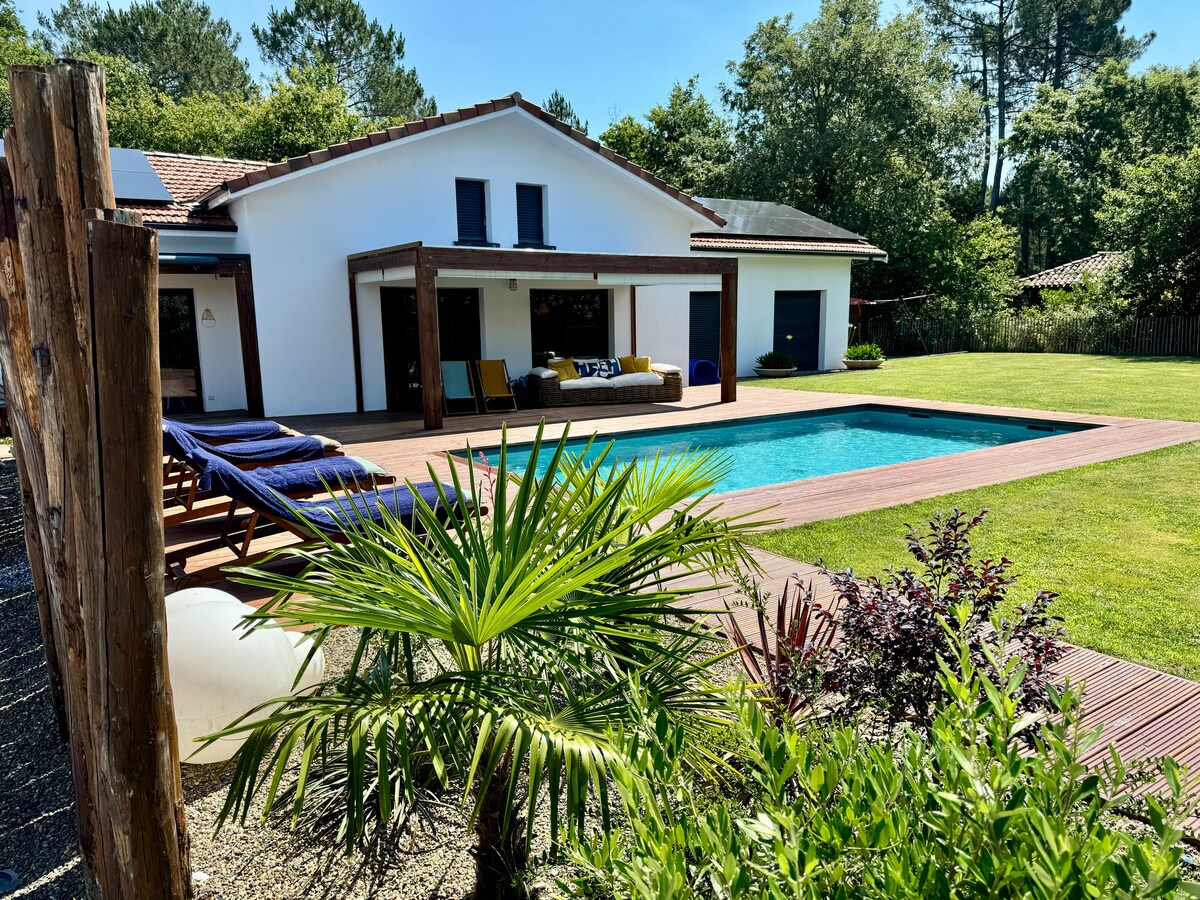Maison neuve entourée de forêt à côté de la piste cyclable et plages de la côte landaise Elle se compose d’un salon avec cuisine américaine, de 3 chambres dont 1 suite parentale avec sdb et wc , pour finir une autre sdb et wc indépendant . Fibre internet 🛜 Pour l’extérieur une piscine pleins sud de 4 sur 8.5 m chauffée de avril au 11 novembre avec jardin paysager et 110m2 de terrasse en bois . Plage et golf de Moliets et maa à 10mn Vieux boucau 15mn Hossegor 28mn . Biarritz 50mn