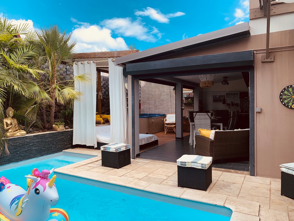 Dans les hauteurs de saint Leu, une vue panoramique. Villa entièrement équipée pouvant vous accueillir pour un week-end ou la semaine entière pour vous détendre en famille ou entre amis. A 20-30min des plages et d'un centre commerciale , à 5 min d'une superette. Avec spa, Babyfoot, table de ping pong, hamac et un Coin barbecue vous aurez plus envie de partir. Internet, Netflix, Disney, Parking pour 4-5 voiture. Fêtes bruyante et animaux non autorisée.