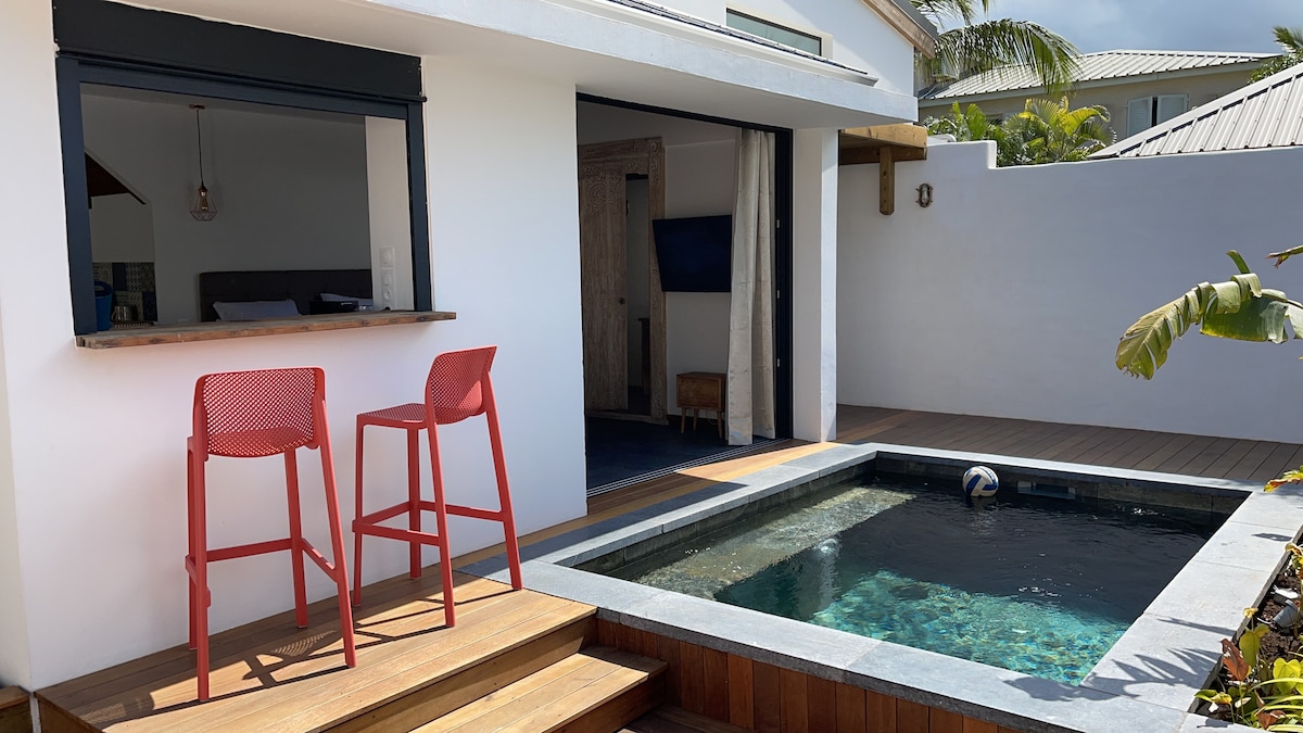 Charmant bungalow en bois, avec kitchenette, salle d'eau et toilette. Le bungalow est attenant à la villa mais indépendant, avec une petite varangue et un jardinet. La résidence est située à 300mètres de la plage de trou d'eau (lagon), dans une impasse calme et un jardin plein d'arbres et d'oiseaux. L'hébergement peut accueillir confortablement 1 couple. Une banquette lit dans la même pièce offre un couchage pour 1 personne supplémentaire.