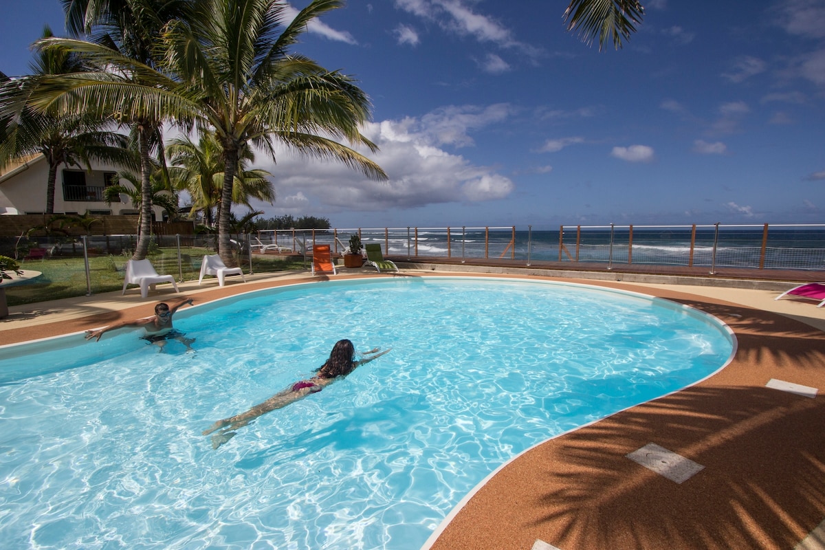 Claude et Valérie seront heureux de vous accueillir au Clos de Val, dans un joli F1 totalement indépendant de 35 m² avec une très belle vue mer. Vous pourrez profiter de votre propre varangue et des espaces partagés : le jardin joliment arboré, la piscine chauffée, le hamac et les transats à votre disposition. (Les espaces partagés tel que la piscine, sont accessibles uniquement aux locataires).