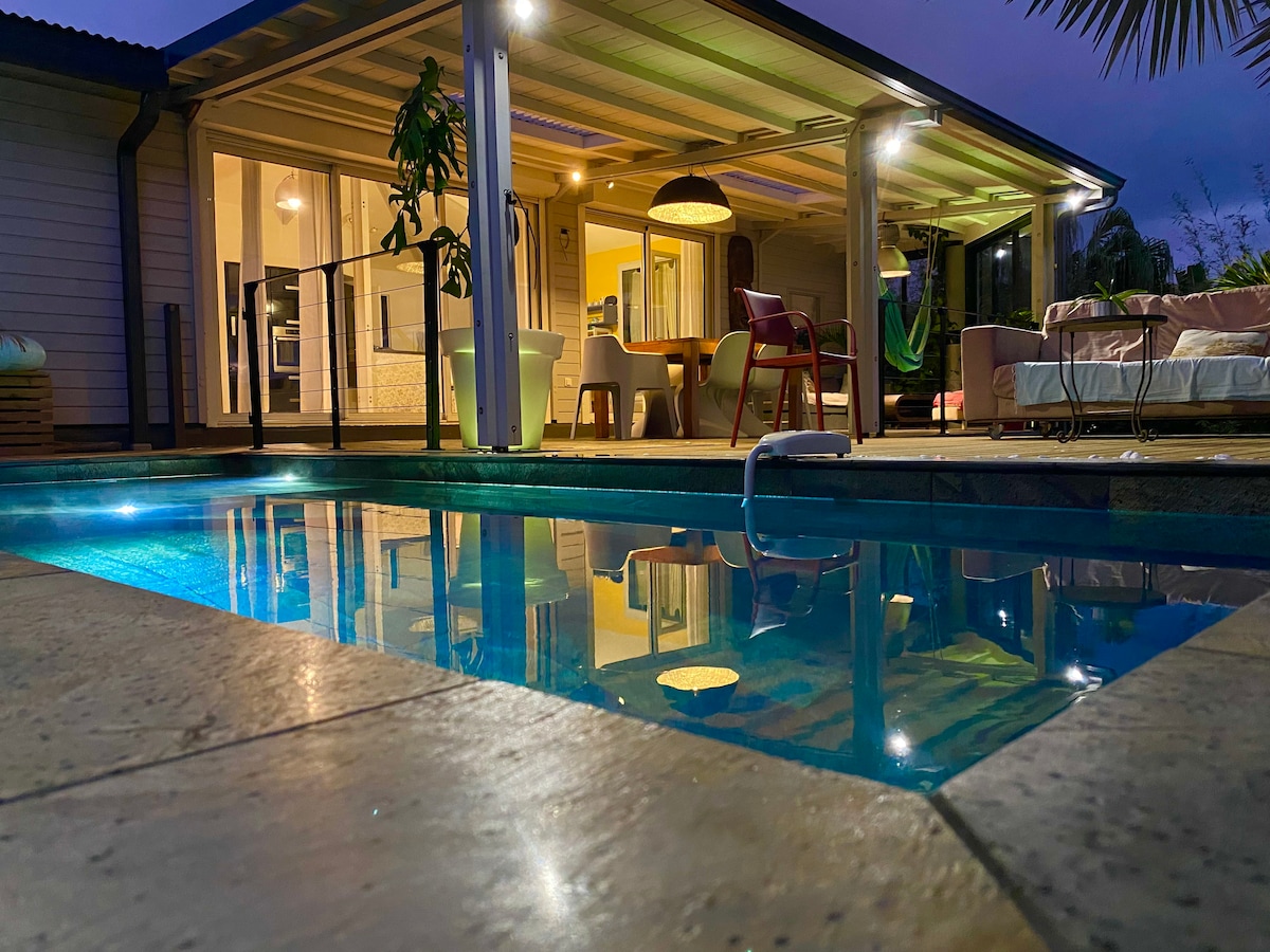 Modern Creole style wooden house with high-end private jacuzzi. 5-star rated vacation rental guaranteeing an optimal level of comfort and facilities. 160 feet from the sea ! Paddle board and snorkel masks provided. - 3 large air-conditioned bedrooms + brewers - Queen size beds & hotel range mattresses - free NETFLIX TV lounge + lounge under terrace - Fully equipped kitchen - Fiber optic Wi-Fi - BBQ in nice garden 100 m2 with deckchairs - Superb family beach & lagoon