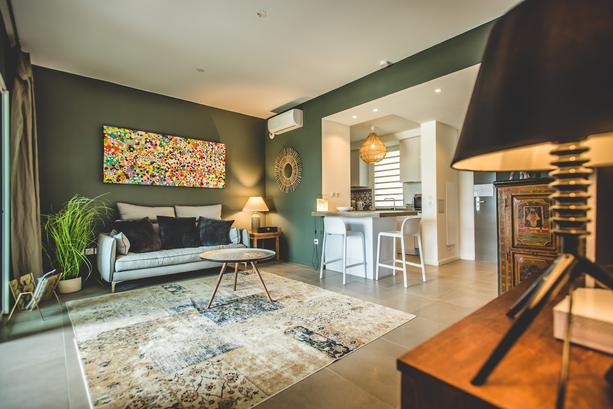 Ce logement unique est proche de tous les sites et commodités, ce qui facilite la planification de votre visite. Ambiance jungle chic garantie ! Suite cosy décorée façon nature, climatisation, cuisine équipée et salle de bain moderne. À l’extérieur : jacuzzi privé + douche tropicale dans un jardin végétalisé. Parfait pour une escapade détente ou romantique.