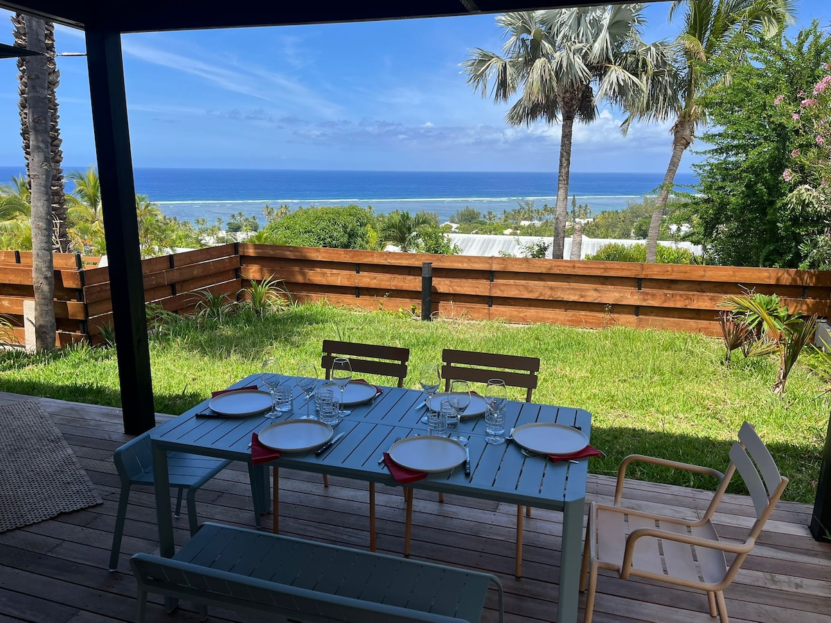 De notre villa , de la piscine ou de la varangue, vous profiterez d'une vue exceptionnelle sur l'ocean, la baie de St Paul, le cap La Houssaye. Les couchers de soleil sur l océan indien s'offriront à vous chaque soir. Vous apprécierez le calme et le confort de notre villa, récente et parfaitement équipée : le séjour, avec sa double hauteur sous plafond , s'ouvre entièrement sur la varangue et la cuisine . Accès rapide à la route des Tamarins (10 min) et aux plages, lagons (20 min).