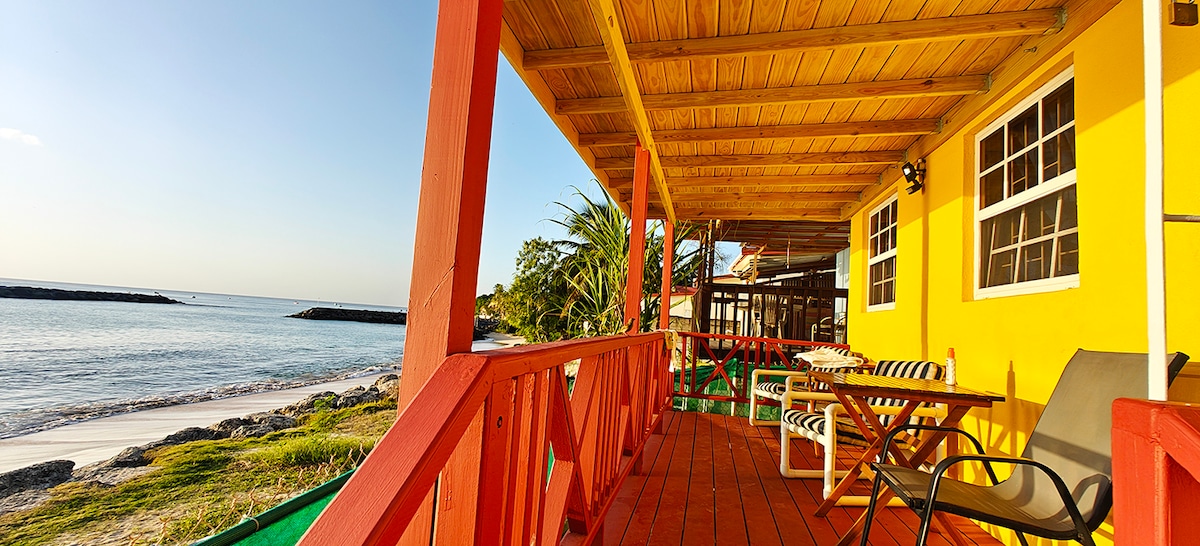 Aquatreat is a bright yellow, cozy home on the Northwest coast. It's a simple, affordable place to stay right on the white sandy beach. The sheltering reef makes swimming calm and safe, provides a home for fish and other sea life you can admire while casually snorkeling. Almost everyday you can wallow with the sea turtles who swim right up to the reef on shore. Make sure you snap a photo! Spend the day on the beach and then unwind on the patio with an unencumbered view of the incredible sunset.