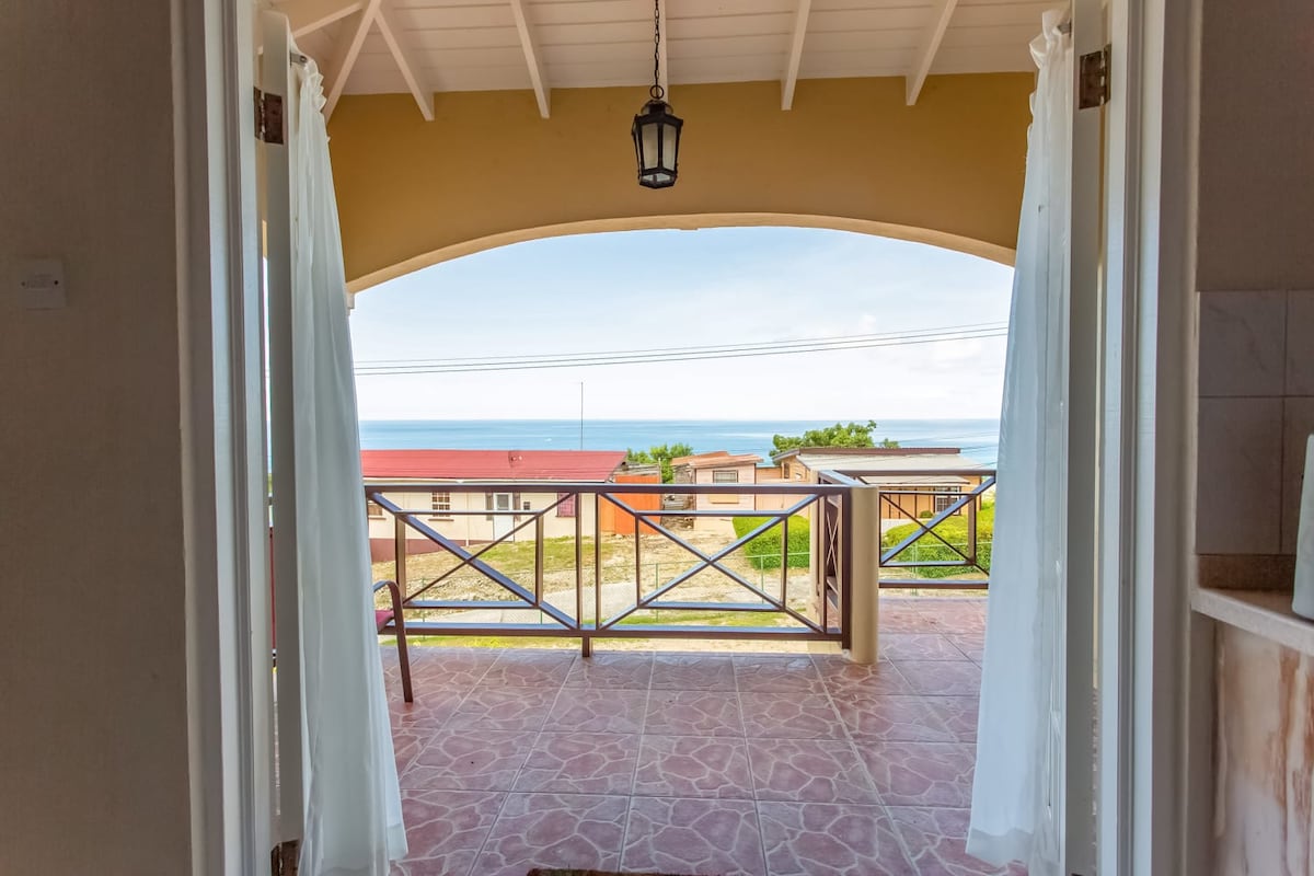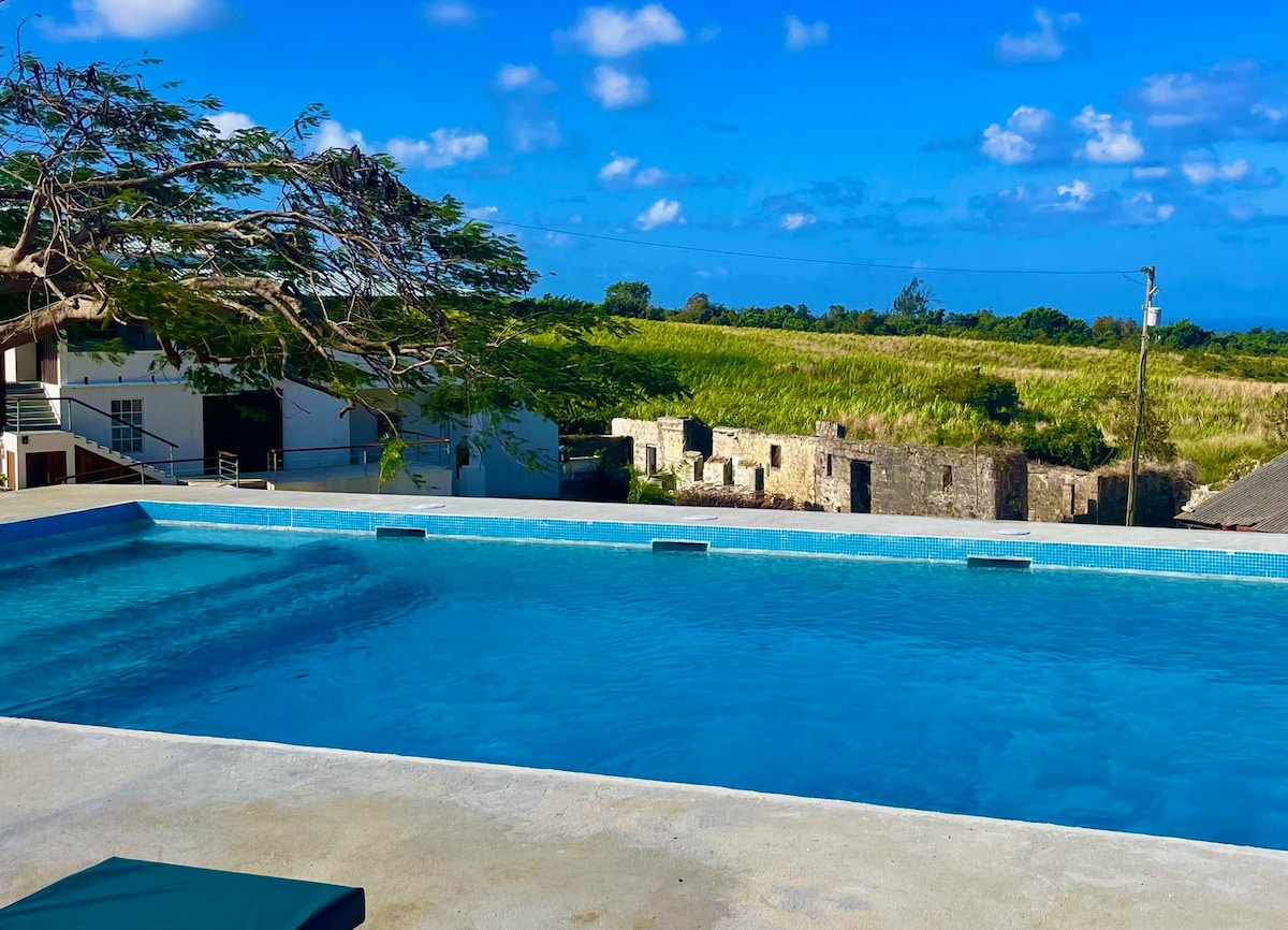 This 1- bed apartment, has a large private covered outdoor dining area with sea view. Located on a peaceful 10 acre plantation, surrounded by rolling fields of sugar cane. A Beautiful 40 ft shared saltwater pool with barbecue area and additional shared dining covered area. The property is connected to walking trails through sugar cane and jungle ravines. Only a 7 minute drive to the beach. Take it easy at this unique and tranquil property.