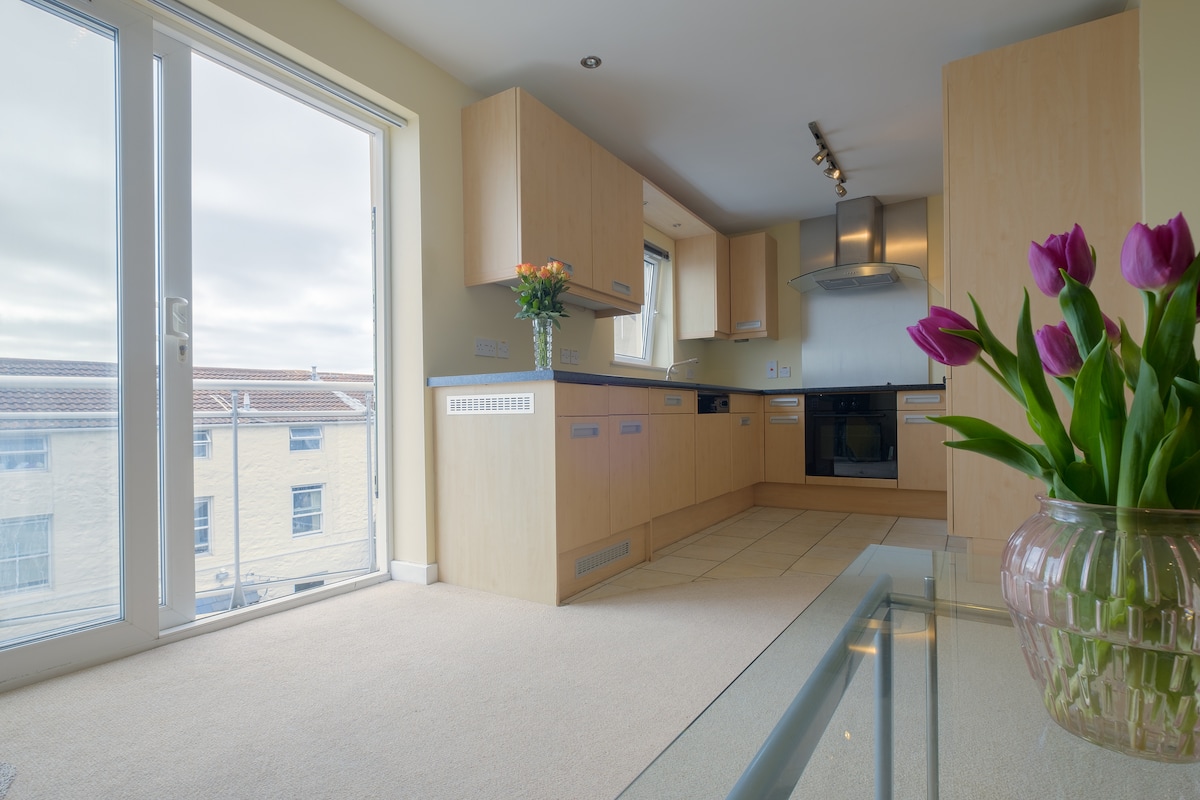 Fully refurbished self contained penthouse apartment on the top floor with views on the park and sea views beyond. Easy walking distance to the bridge or town and access to the beaches with a local bus. Off street parking available. Private kitchen, including bean to cup coffee machine.