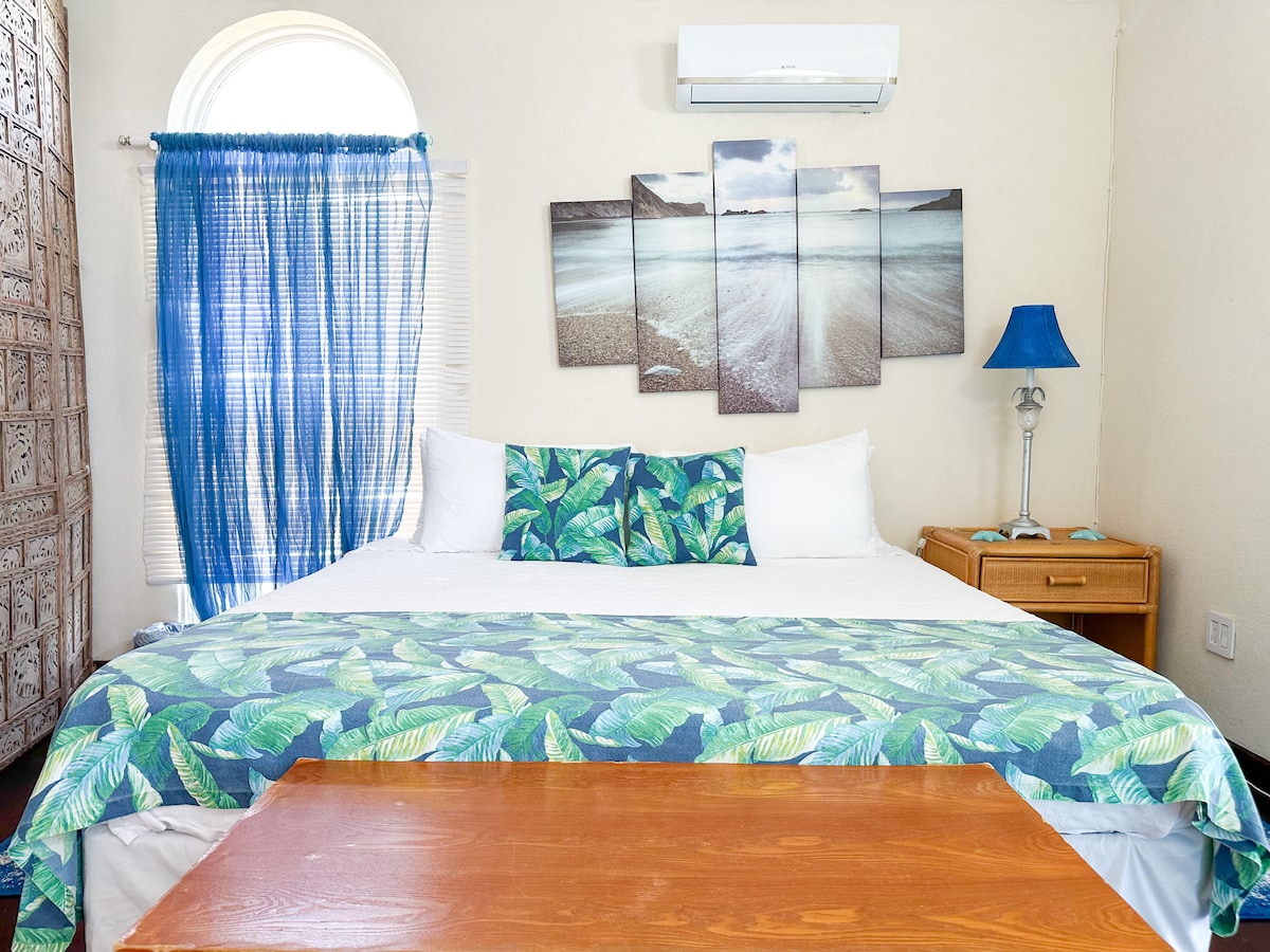 This Oceanfront studio apartment can sleep 2-3 guests. It features a full kitchen, AC, SMART TV, 1 Queen Bed, 1 Single Bed, bathroom with both a shower and an asian soaking tub and a balcony. There is WIFI throughout and shared access to the pool. We are a 9 minute drive away from Six Roads which has a few supermarkets, fast food restaurants and banks.