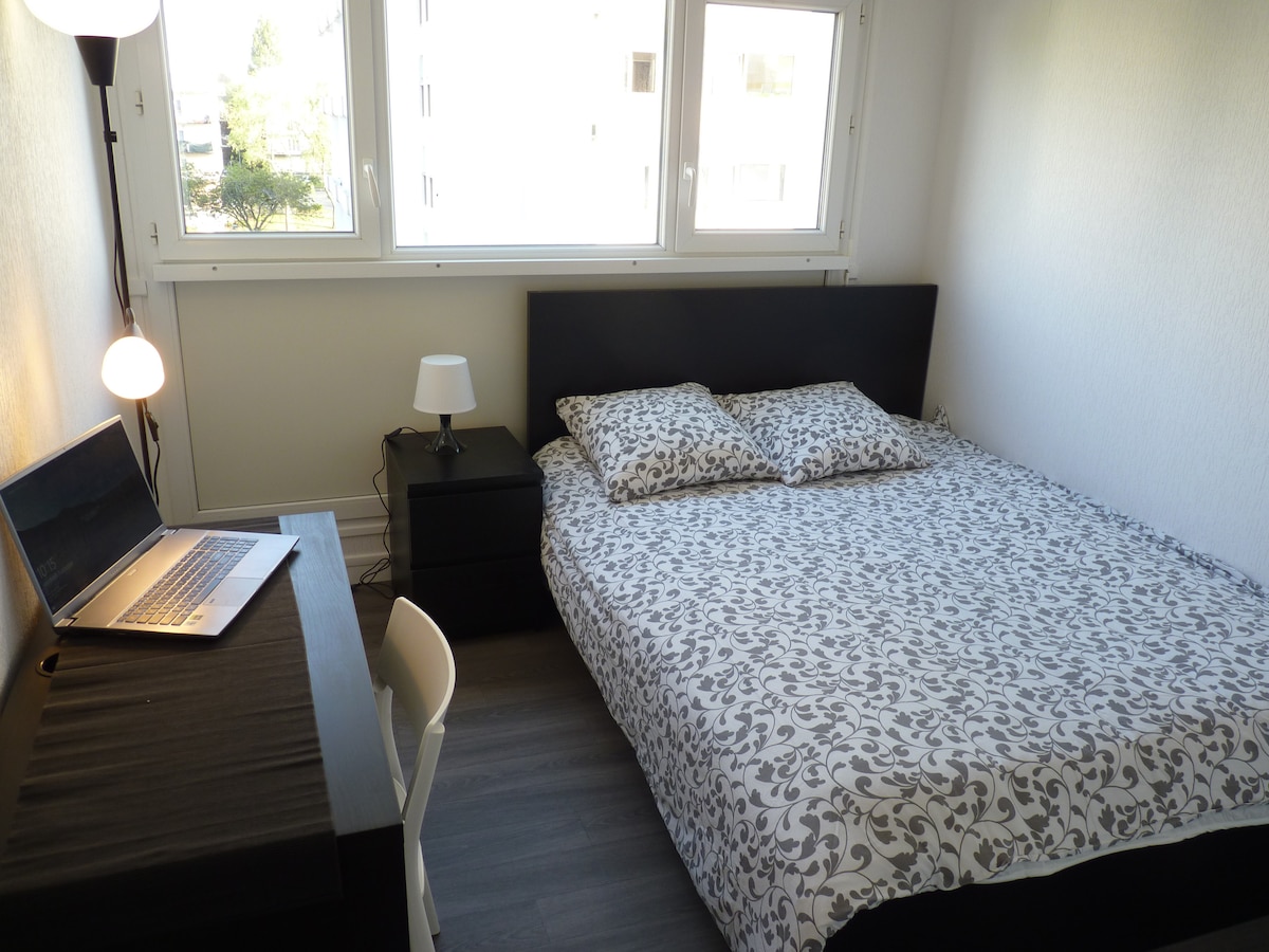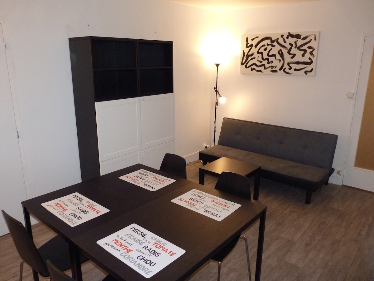 Joli petit appartement entièrement rénové et redécoré Proche tramway , bus et commerces. Quartier très calme. Places de stationnement gratuites dans la rue et parking privé . Couchage, linge de nuit et linge de toilette de qualité. Lit parapluie à disposition ainsi que le protège-matelas Rangement important à l'entrée ( penderie et tablettes , y compris pour les bagages) Volets roulants permettant le noir total.