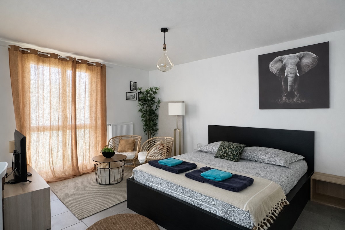 Situé à seulement 20 min de Lyon et à proximité des axes autoroutiers, le studio vous offre un cadre calme et paisible. Ideal pour une pause sur la route de vos vacances ou un séjour professionnel. Le studio est équipé d'une kitchennette pratique et entièrement équipée. Ce que vous allez adorez : 🌞Balcon ensoleillé ☕️Café , 🫖 Thé et eau sont mis à disposition 🏕 Confort et tranquillité garanti 🏡Le studio est situé à l'étage de notre maison avec jardin et entrée indépendante
