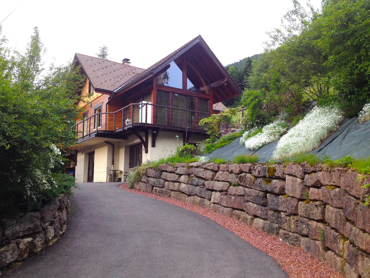 le chalet se trouve dans un secteur très calme entouré de bois avec des parcours de promenade dans la forêt à 200 mètres. Terrasse extérieur couverte avec canapé et fauteuil pour une bonne détente. Nous sommes à 45 min des premières stations de ski. Notre habitation se trouve à 10mètres donc nous serons vous conseiller si besoin et serons très réactifs en cas de problème. Tout est prévu pour que vous puissiez passer un bon séjour en toute tranquillité. Il ne reste plus qu’à réserver 😊