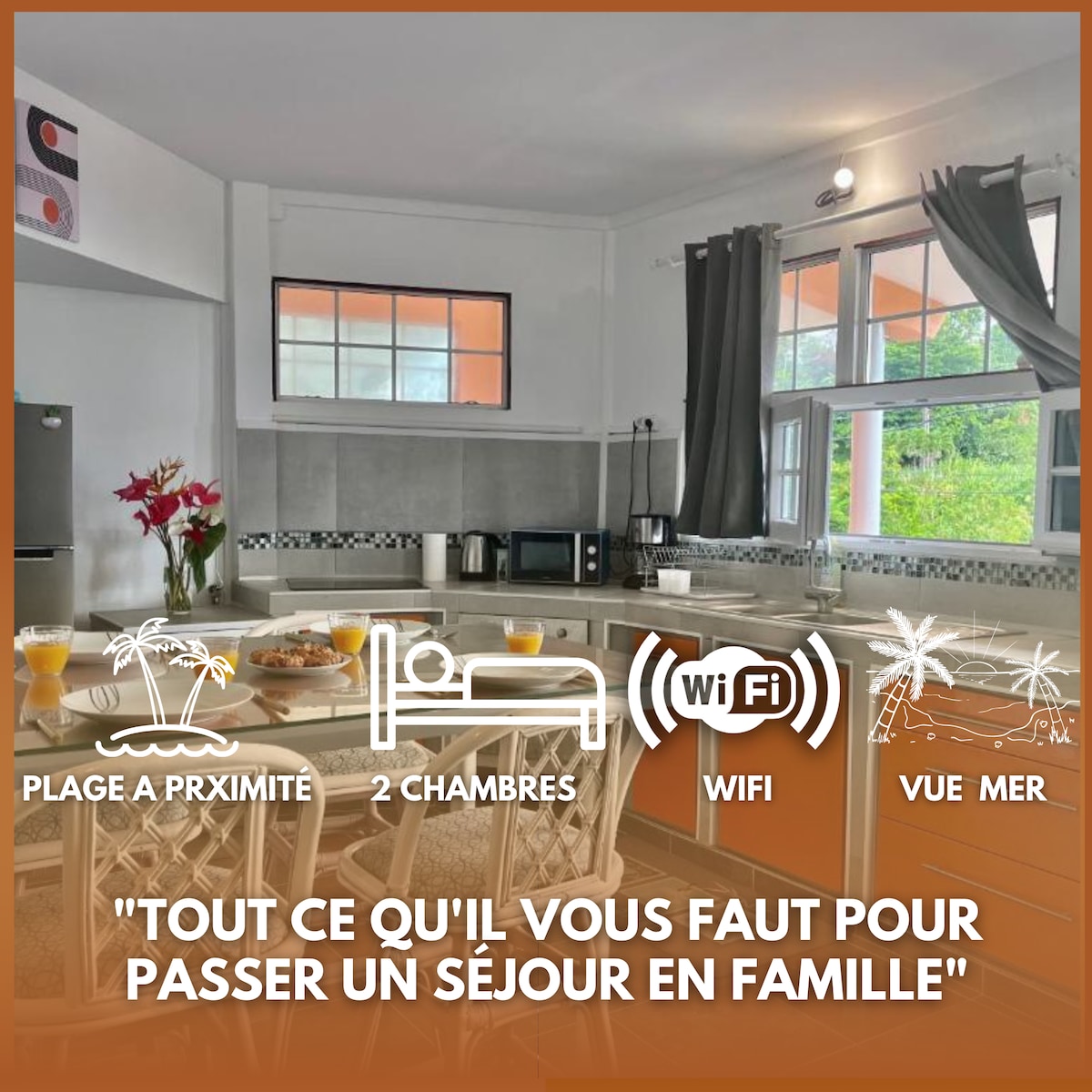 Bel appartement situé en bas de villa dans les hauteurs bourg du Carbet, au Nord Caraïbe de la Martinique. Il vous offre un grand espace de vie extérieur pour les amoureux de la nature, avec sa véritable cuisine sur la terrasse, sans compter la superbe vue mer. Dans une résidence calme, entre amis ou en famille vous pourrez ainsi vous laisser bercer le soir aux bruits des vagues. Vous aurez le privilège d'apprécier nos superbes couchers de soleil .... laissez vous tenter....