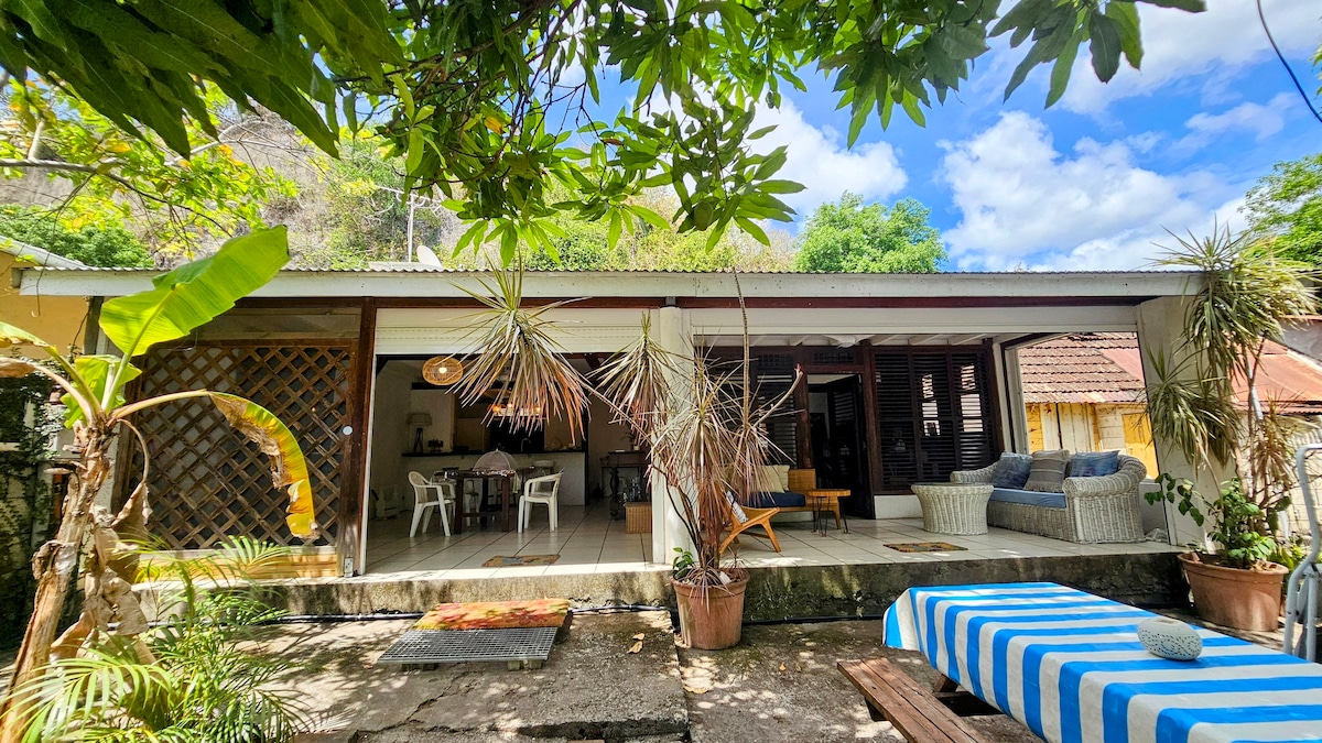 Ce petit bungalow est situé à 5 min du bourg de Saint Pierre en Martinique Accès direct à la plage de galets bordée d'eaux cristallines et de multitudes de petits poissons. Vous aurez peut être le privilège d'assister à un spectacle très rare: la ponte des tortues ou l'éclosion des œufs ou encore voir les petites tortues regagner la mer pour de nouvelles aventures ( dans le respect de la nature).. Ou assister et participer à la sènne ( pêche traditionnelle avec des filets). En pleine nature!!.