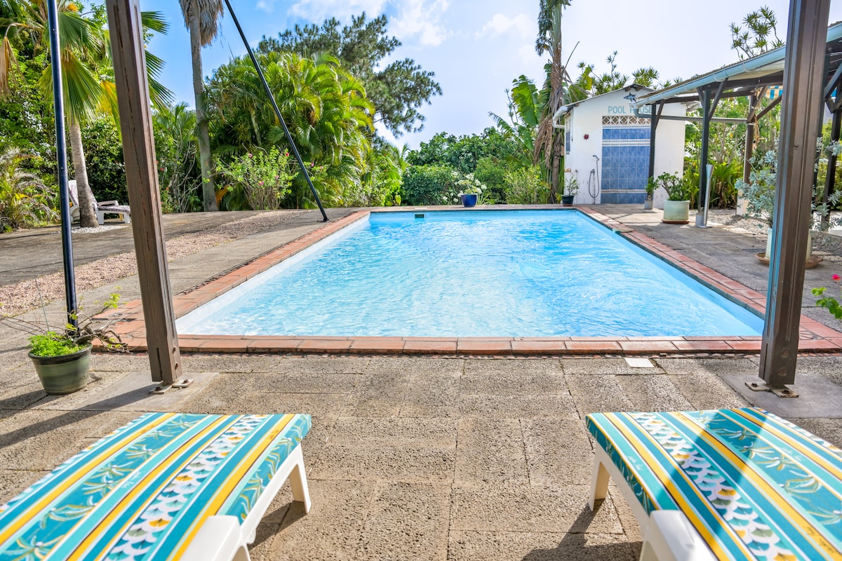 Maison rez-de-chaussée et premier étage : suite parentale climatisée + 2 chambres et sdb, cuisine équipée, TV, coin salon et repas sur terrasse entièrement à votre disposition et indépendante. Vous aurez accès à toutes les commodités de la propriété : piscine, jardin, 1 place de parking, bar extérieur, barbecue. Les propriétaires sont en rez de jardin avec 3 chiens isolés d'une barrière. Villa entre Schoelcher et le Carbet. Proche plongée, sorties bateaux, plages, casino, restaurants..