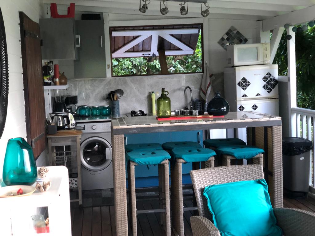 Bungalow tranquille avec 2 chambres, cuisine ouverte et salon. Terrasse avec vue mer et Mont Pelée, coin détente, transats et barbecue. Jardin tropical avec goyavier et avocatier. À 10 min en voiture du Carbet et de la plage. Idéal pour un séjour relaxant dans une atmosphère tropicale.