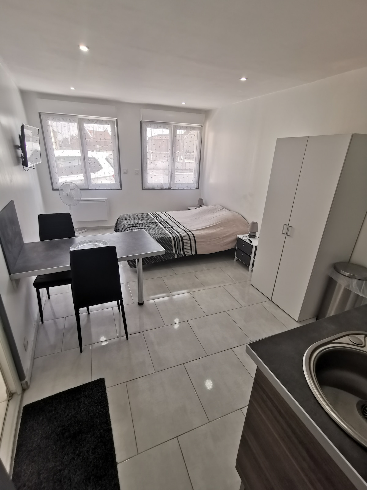 Tiny House avec place de parking privative au coeur de la cité médiévale. Accès direct rue piétonne et Cathédrale. Lit 160x200, tv, cuisine équipée, plaque vitro, micro-onde/grill frigo, grille pain, bouilloire, cafetière à filtre, Tassimo, ustensiles de cuisine, aspirateur, cintres, sèche serviettes, douche à l’italienne, chauffage, linge de toilette, lit parapluie (sans draps).