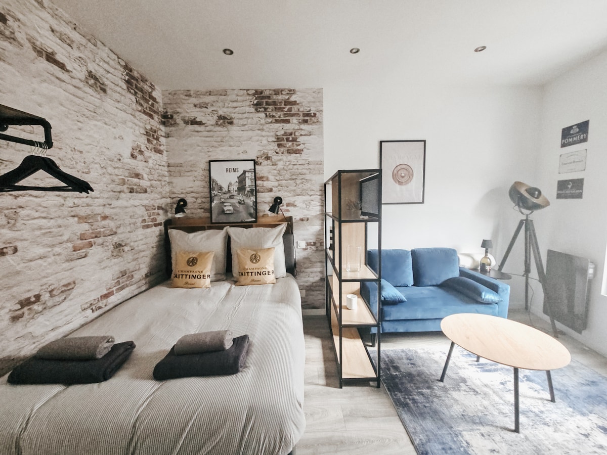 Welcome to our superb, large, chic, high-standard studio apartment, completely renovated by an architect and located right in the heart of Reims' hypercentre! You won't find a better place to explore all that this beautiful city has to offer. The location is simply unbeatable - next to the train station, Place d'Erlon and Boulingrin, as well as all the amenities you could wish for. !!!!! Vélos interdits dans l’appartement !!!