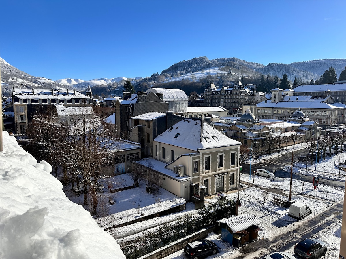 En hyper centre, très bel appartement T2, 37 M² au 2e étage avec balcons. Idéalement situé à proximité des thermes et de toutes commodités. Il se compose d'une agréable pièce à vivre combinant séjour et cuisine équipée ainsi qu'un canapé convertible en lit de 140cm. Le tout exposé sud et ouest ouvrant sur 2 balcons desquels on peut admirer un magnifique panorama du Sancy au Puy de Gros! IL dispose d'une chambre avec rangements et un grand lit en 180cm. Enfin une salle d'eau avec douche et WC.