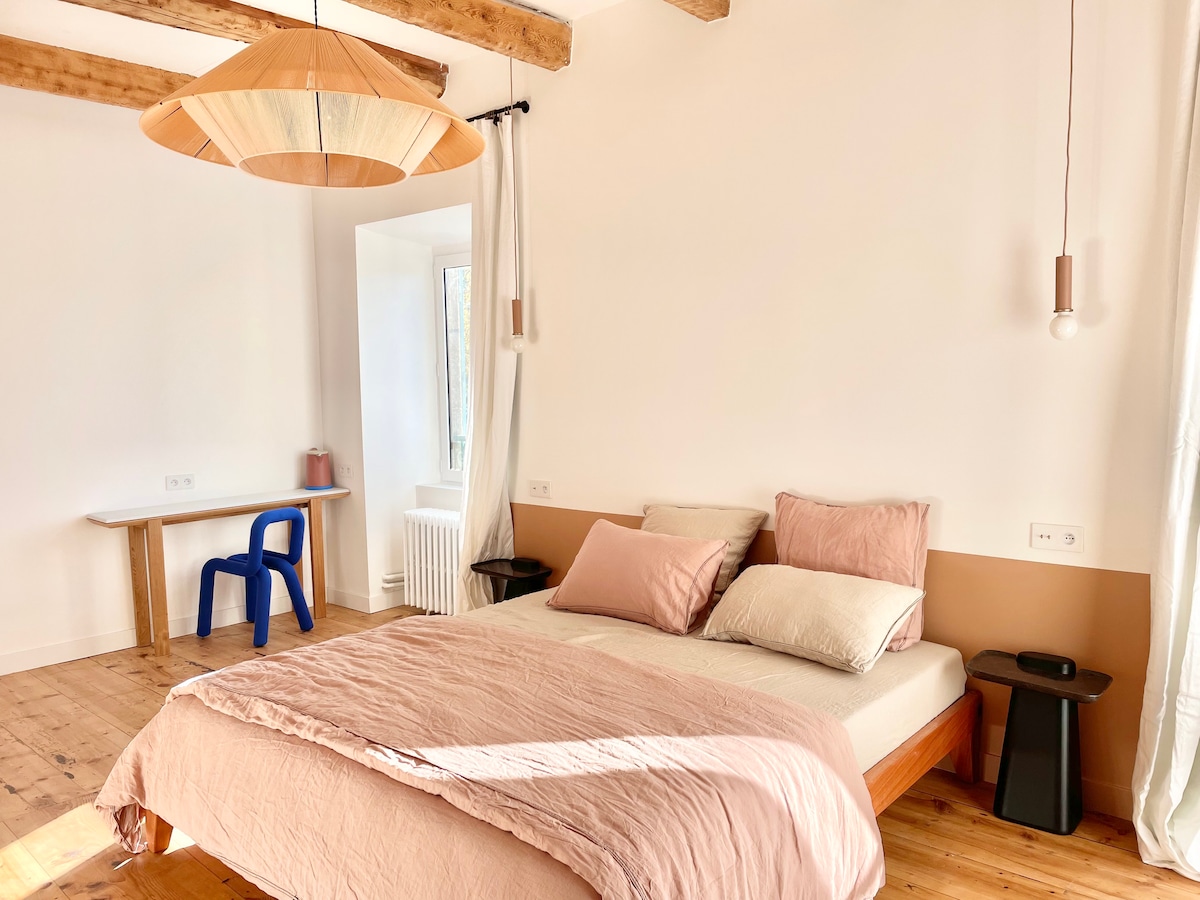 Après plusieurs années dans le domaine des neurosciences à Paris, deux rénovations totales et un bébé, nous souhaitions un retour aux sources. C'est tout naturellement que nous nous sommes tournés vers l'Auvergne qui a vu naitre mon mari. Après quelques recherches, nous sommes tombés amoureux de cette maison vigneronne de 1850, de son village, ses habitants et ses environs. Nous avons cherché à créer un lieu unique, à la croisée des chemins entre l'hotel de charme et la chambre d'hôtes, l'authentique et le contemporain, le naturel et le coloré, le raffinement et le ludique. Soucieux de notre impact écologique, le mobilier neuf ainsi que le linge de lit est eco responsable. Désireux de soutenir le tissus économique et social local, nous avons opté pour des savons et shampoing solides fabriqués dans le village. Nous collaborons également avec des masseuses qui viennent à la maison sur rdv pour des soins. Le jardin de 2000 m2 vous permettra de vous évader, somnoler sous un arbre, faire un plongeon dans sa piscine ou encore vous essayer à la pétanque. Des jeux de société sont mis à votre disposition ainsi que des ouvrages sur la région et un baby foot pour des parties endiablées. Nous sommes idéalement situés dans un petit village authentique et vous trouverez plusieurs chemins de randonnées au pied de la maison. Vous serez également proche de très beaux sites naturel d'Auvergne : le village classée de Montpeyroux à 5min, le lac Pavin, le lac Chambon et la vallée des fées à 20 minutes, le Puy de dôme à 30 minutes et la station de ski de super Besse à 35 minutes. Nous sommes aussi à 15 min de la route des fromages avec notamment le village de saint nectaire, mais également entourés de très bons restaurants dont un étoilé à quinze minutes de la maison. Bref, vous l'aurez compris venir chez nous c'est la garantie d'une évasion sur-mesure. Dans la chambre Pavin particulièrement romantique, vous trouverez un lit king Size, une baignoire ilot , des toilettes séparées et un espace confortable de plus de 35 m2.