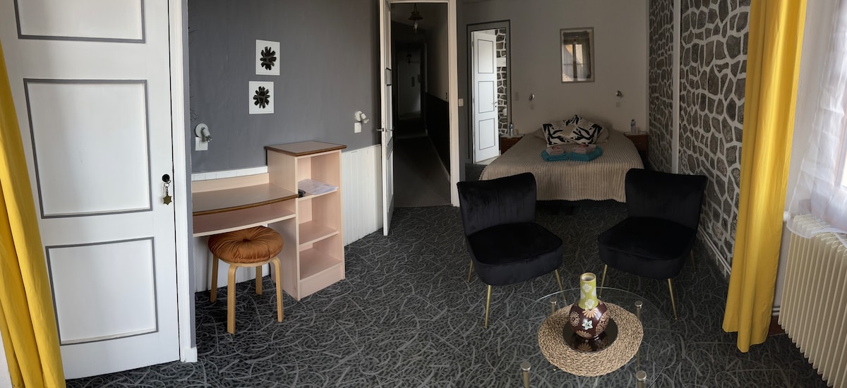 Grand appartement duplex SANS AUCUN ESPACES À PARTAGER (ce qui n'était pas le cas avant). Chambre climatisée à l'étage, avec douche hammam (bain de vapeur), lit Emperor (2x2m) dans ancien hôtel rénové, salon TV privé, au centre du village en désertification de Rochefort-Montagne. chambre : Matelas 2x2m sur cadre à lattes, machine à café Senseo, bouilloire et petit réfrigérateur. Draps/couettes/serviettes fournies, Wifi à chaque étage, Grande Cuisine au rez-de-chaussée, salon, TV Android.