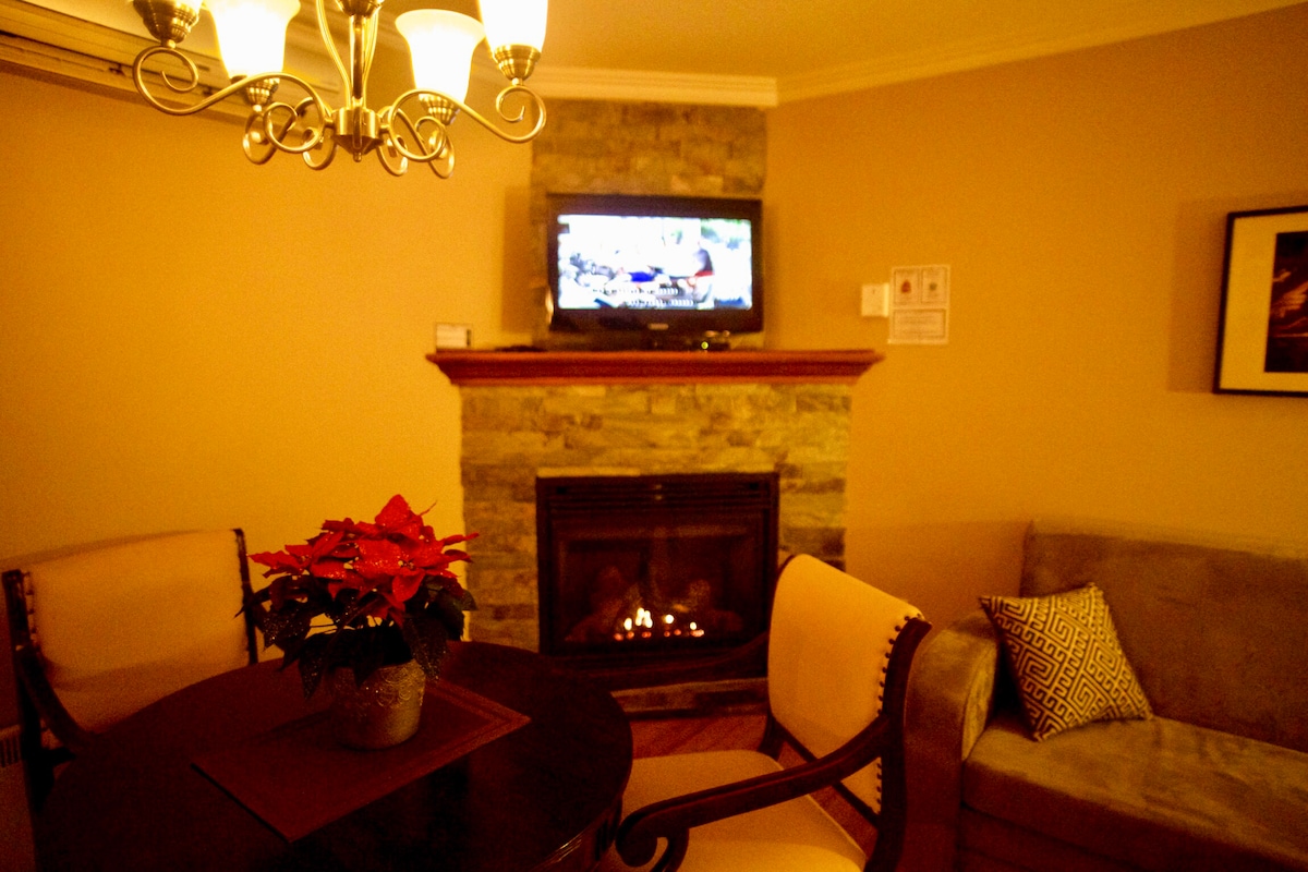 C'est un charmant studio situé dans la charmante vallée de St-Sauveur. Studio supérieur avec 1 lit king size. WiFi gratuit et parking gratuit. Parfait pour les couples et les voyageurs en solo. À seulement quelques minutes des pistes de ski, à quelques minutes à pied des magasins, des cafés et des restaurants, à proximité du golf et des toboggans. Cheminée, coin repas, cuisine complète, lave-vaisselle, bain, douche séparée et commodités.