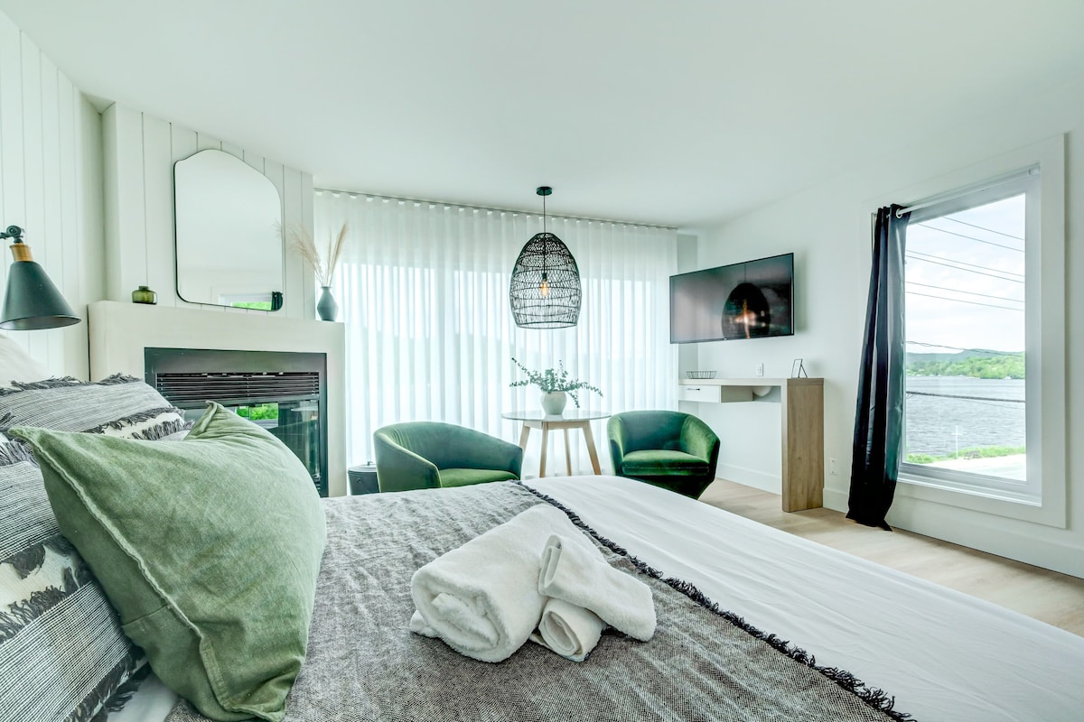 Ancienne Suite supérieure de l'hôtel St Sauveur maintenant en condo avec foyer ,cuisine, chambre fermée ,baignoire therapeutique ,avec vue sur le mont St Sauveur a pied de tout ,épicerie ,village,mont St Sauveur , This fabulous suit will offer you a complete service, full kitchen, therapeutic bath, fireplace, magnificent mountain view.