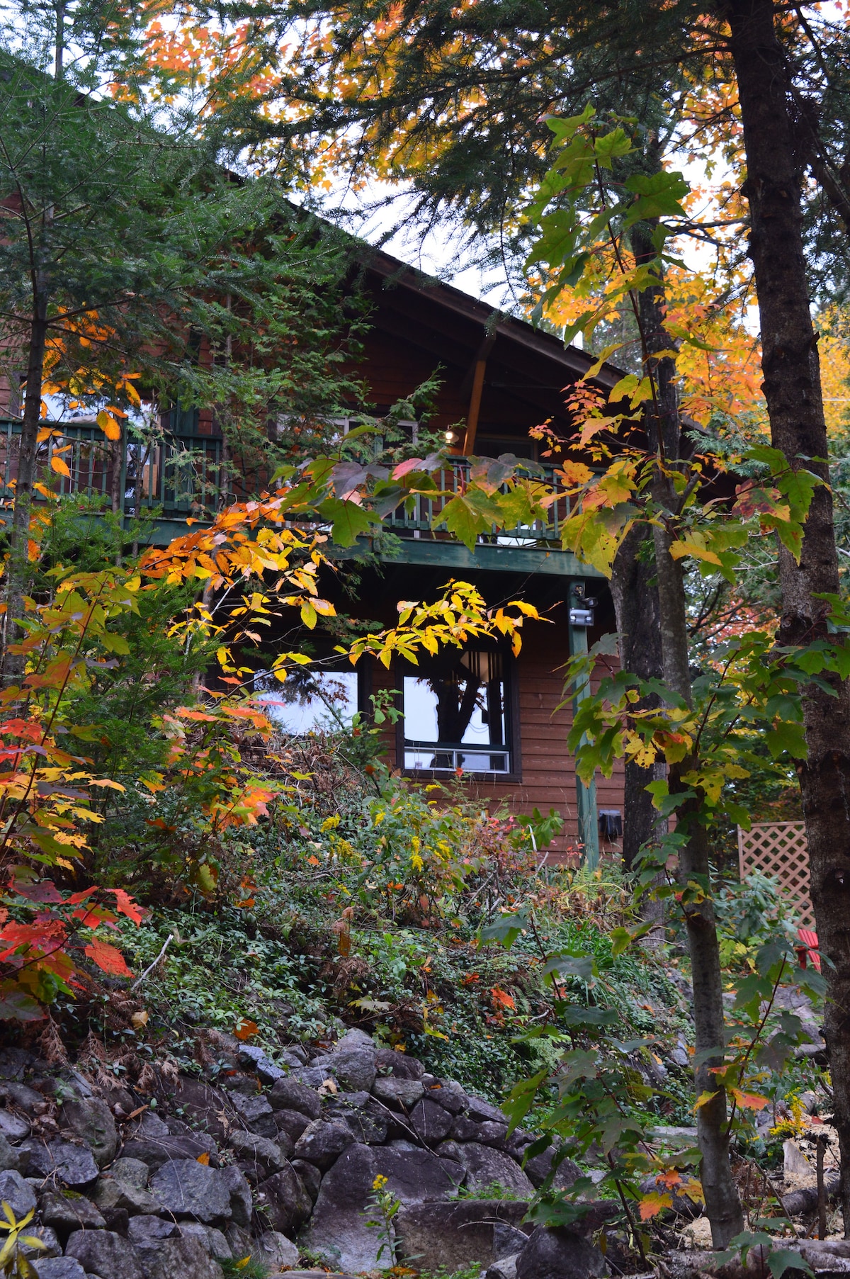 Cozy, small 2 BR chalet with lake access nestled in nature on 30 000 square feet of land. Indoor fireplace & outdoor firepit with wood provided. Relax in the outdoor Sauna or take a swim in the lake. Amenities, grocery stores, malls, restaurants 10-15 mins away. Walking/hiking trails, snowshoeing, skiing amongst many summer/winter activities. Mont Saint Sauveur is only a 10min drive. Very peaceful and quiet and great for nature lovers.