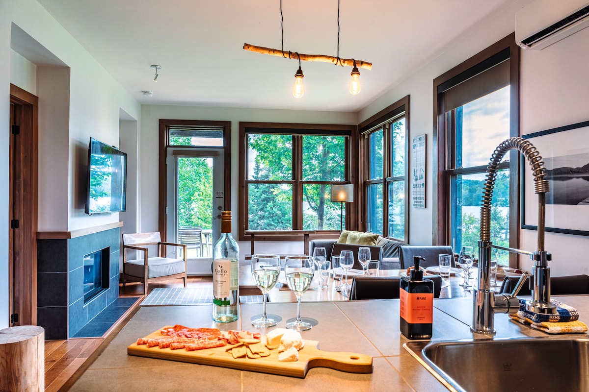 Laissez-vous séduire par la déco inspirée de la nature et des coureurs des bois! Cuisine 100% équipée pour préparer vos repas ou en déguster un des nombreux restaurants situés à proximité. Relaxez dans l'espace salon près du foyez ou dans le douillet lit queen après une longue journée à explorer la région. L'unité est équipée de l'air climatisée...Wifi haute vitesse et Netflix.