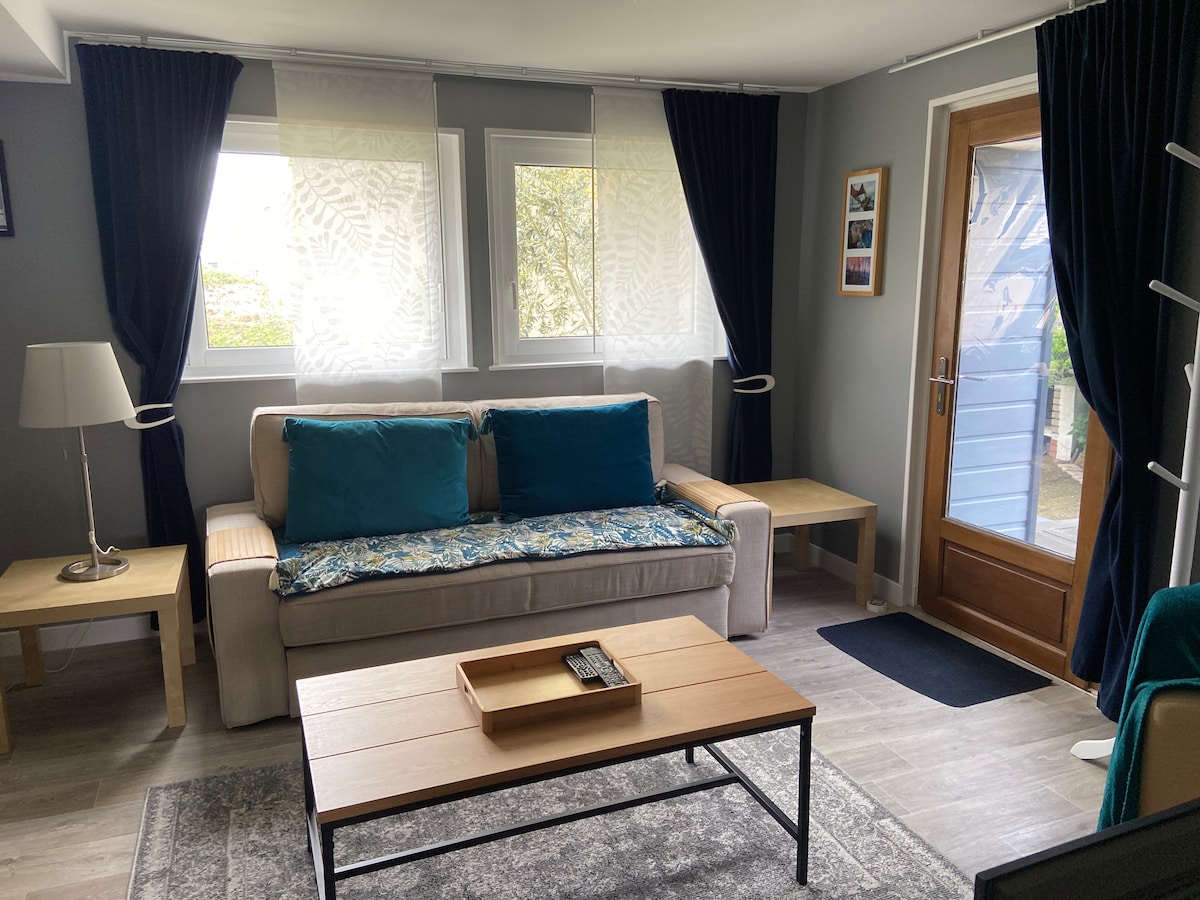 Appartement cosy, chaleureux de 46 m2 avec terrasse Sud aménagée, arborée en RDC (32m2) dans résidence récente et calme. Bien chauffé l’hiver. Parking gratuit A 5 mn à pied de la gare proche de ts commerces, 15 mn à pied de la ville historique et des plages Linge de lit fourni sur demande : 10 € par lit pour le séjour Serviettes de toilette fournies gratuitement Un 2è WC indépendant de la salle de bain Wifi gratuite Nbrx restaurants proches cuisinent en formule à emporter. Télé travail possible