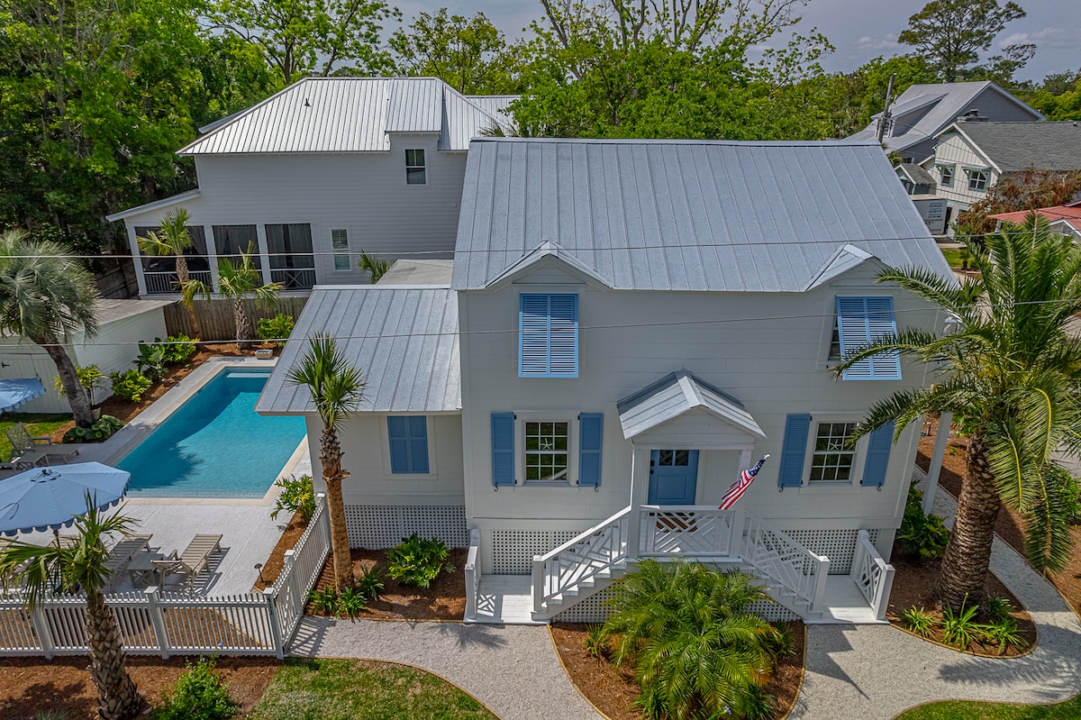 Welcome to Savannah Cottage in the Coast Cottages neighborhood. Just steps from the beach, this spacious retreat is perfect for families to relax and make memories. Hop on a bike or golf cart and you’re minutes from SSI’s village pier, shops, and restaurants. Unwind with ocean breezes on three porches—ideal for morning coffee or sunset cocktails. Families enjoy two private-access pools, a pavilion, and a boardwalk to the sand. For more island fun, follow us @SavannahCottageSSI.