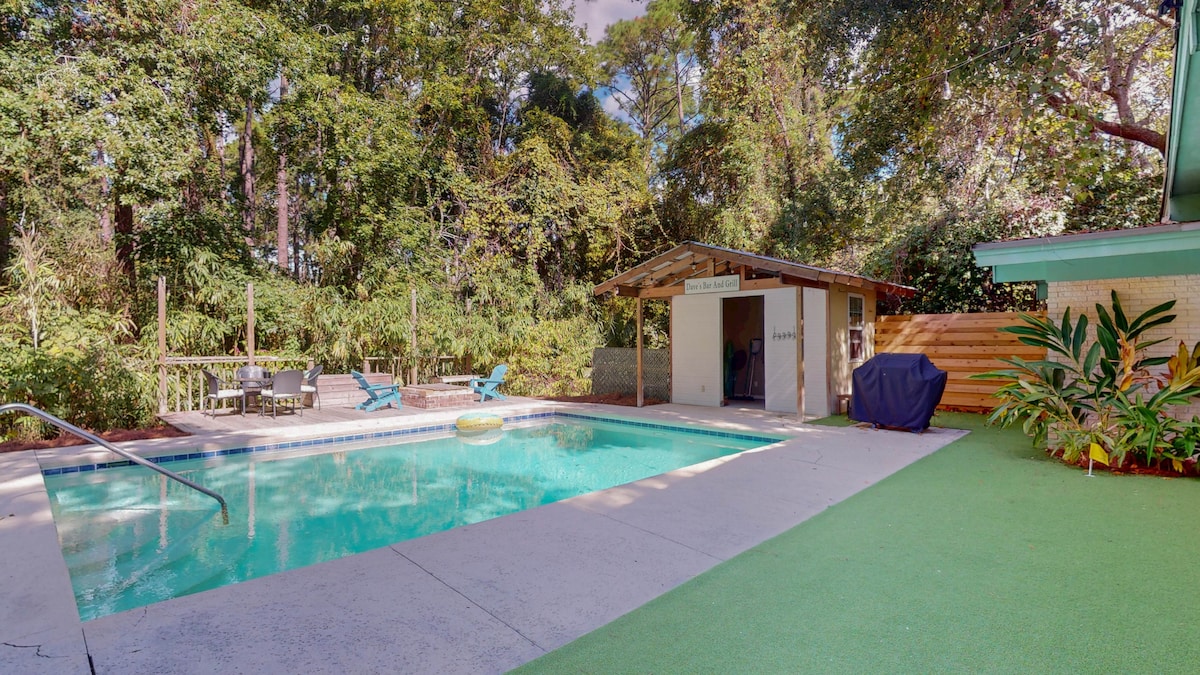 Bring your family and friends to this renovated beach house with over 3,000 sqft for endless fun & relaxation. Centrally located on Jekyll Island, marble countertop kitchen, private pool w/ outdoor fridgeoutdoor tv, grill, & putting green. Upstairs in-law suite w/ second kitchen, patio, living and sleeping area. Ample parking for cars and golf carts! 2 bikes included with each rental! Sorry, our pool is NOT heated! **Nearest beach access point is Porter Lane Boardwalk, approx. 4 houses away**