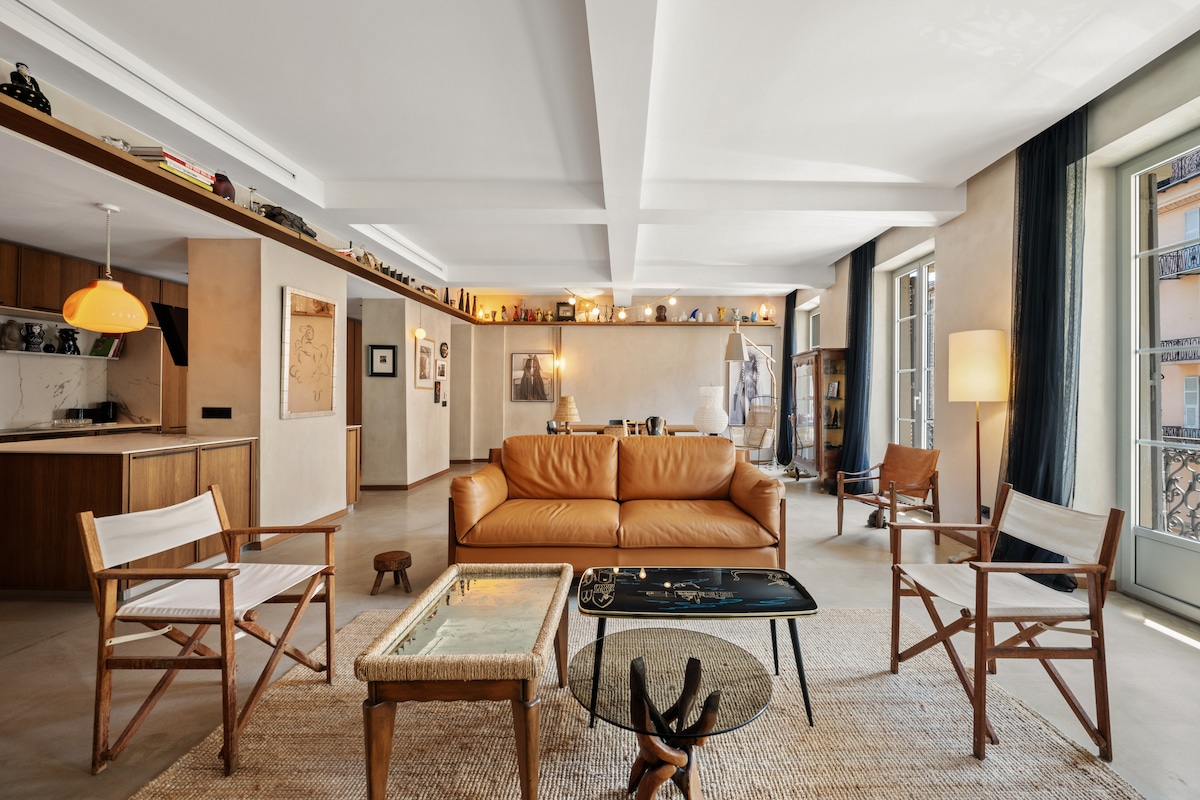 Magnifique 3 pièces de style loft en plein cœur du Carré d'Or, proche Promenade des Anglais et du Jardin Albert 1er. Ce logement unique par sa configuration d'ancien atelier vient d'être entièrement rénové et se compose d'une entrée indépendante par sa veranda, d'une mezzanine, d'un superbe et vaste séjour de caractère avec une cuisine américaine entièrement équipée, de 2 chambres à coucher, d'une salle de bains, 2 WC Climatisation reversible dans chaque pièce et WIFI