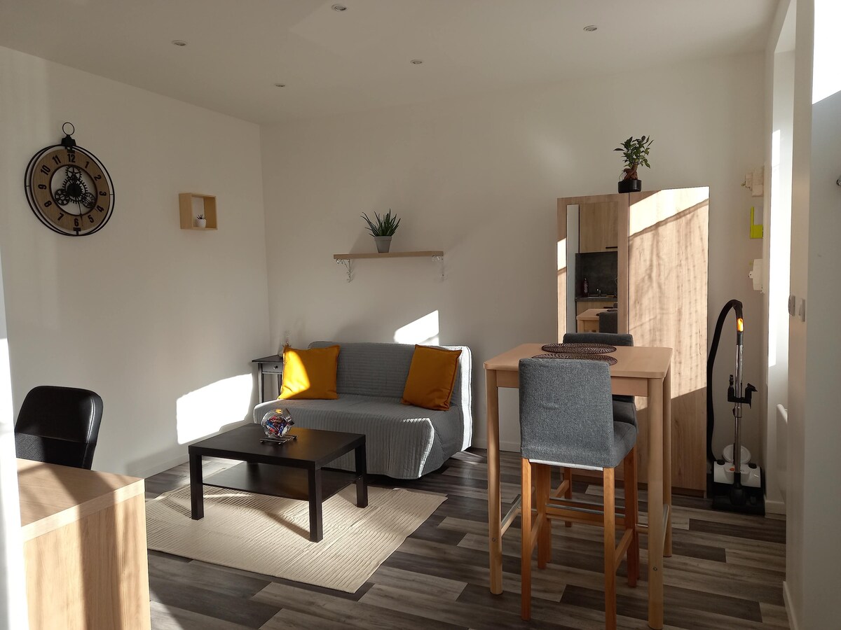 Situé au 1er étage d'un immeuble avec terrasse , le studio est situé sur la gauche.(plusieurs studios sont disponibles en se rendant sur mon profil) Wifi Télévision, cafetière, bouilloire ustensiles de cuisine, tout y est. Terrain clos de 600 m2. Local à vélos sécurisé. Places de stationnement toujours libres juste à côté Proche de toutes commodités. Endroit calme.Une boîte à clés sécurisée est présente afin de vous faciliter l'heure d'arrivée. ANIMAUX ACCEPTÉS CONTRE SUPPLÉMENT DE 5 €.