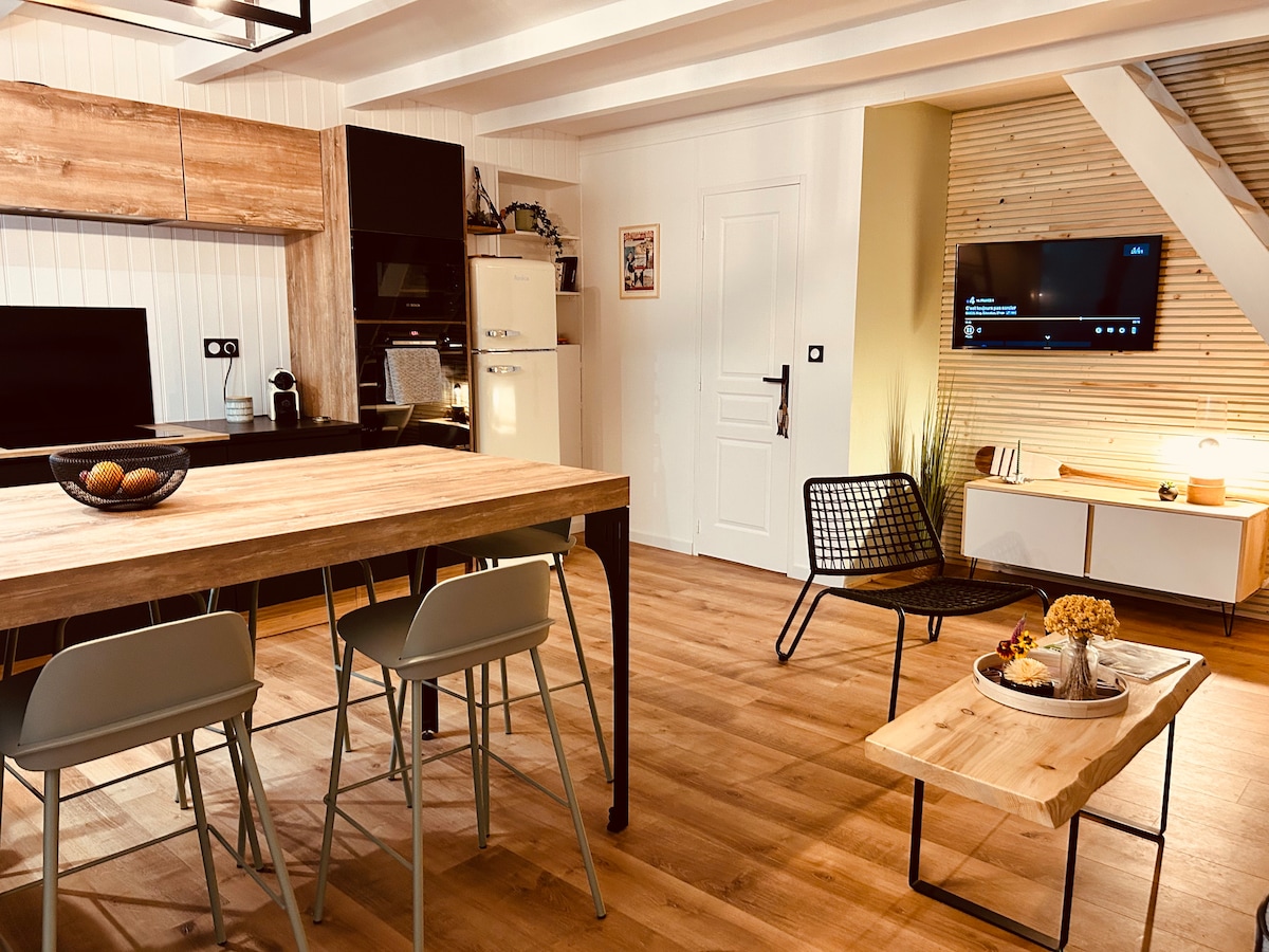 Logement de caractère, décoration soignée. 1 grande chambre pour 2 personnes, douche à l'italienne, wc séparés Séjour avec canapé-lit confortable donnant sur terrasse et jardinet privatif, sans vis à vis, , équipé d'un salon de jardin, parasol, transats et barbecue. Coin cuisine entièrement équipé, lave-vaisselle.