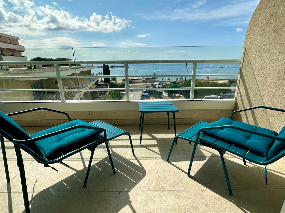 STUDIO en front de mer Centre ville/port/plage en bas du logement Point fort : la mer sous vos yeux à 180°, vous apprécierez la vue extraordinaire sur le Golfe et sur Saint Tropez, ainsi que les magnifiques couchers de soleil La plage & la mer en bas de l’appartement 🏖️😁 St Tropez en ⛴️ en 20’ Checkin 15h /20h Checkout 10h 👉 LINGE INCLUS 👈 Nous vous accueillerons personnellement En cas absence une boîte à clef sera disponible avec une entrée maximum à 21h30 Sans ascenseur