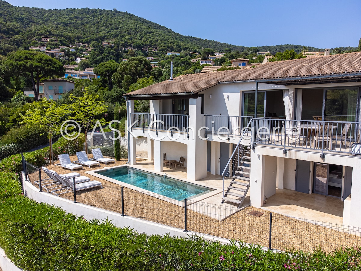 Apartment on the garden level of an architect-designed villa with exceptional sea views from all rooms, swimming pool and terraces overlooking the Gulf of Saint-Tropez. 9x3.6m swimming pool, not heated in extreme heat and in winter. 1 private parking space. 750m from beaches, shops and port, all within walking distance ! We also offer a very nice apartment in Nice. airbnb.com/h/squaremozart