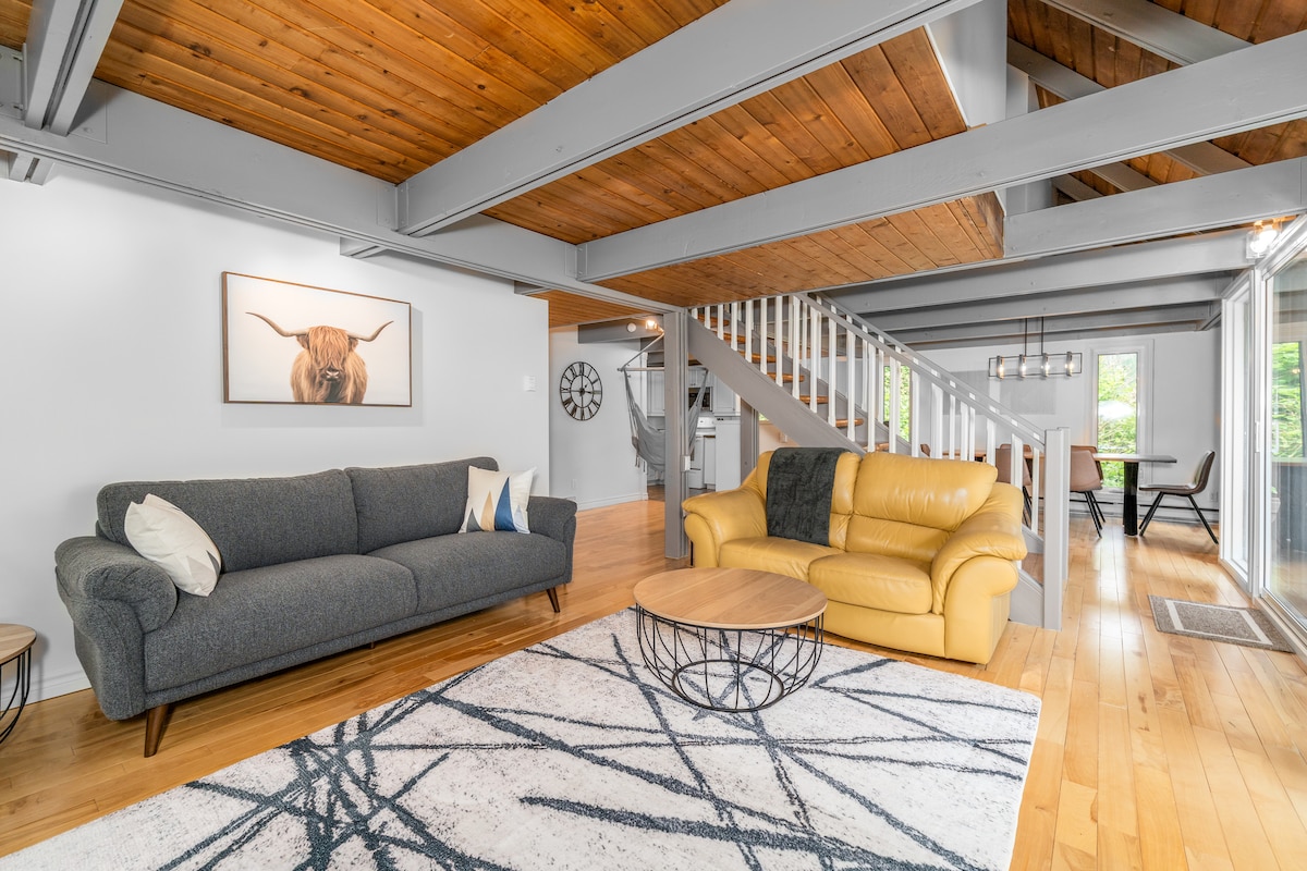 Welcome to our Sky House ✧ By Activ Chalets® Experience the charm of a treehouse with a private balcony overlooking the forest—your peaceful retreat just steps from Mont-Ste-Anne! ➳ 2 parking spots ➳ Elevated deck that feels like a treehouse! ➳ BBQ available year-round ➳ View on the St-Lawrence ➳ Indoor pool, outdoor pool, sauna, and gym in the complex (free access) ➳ Pack’n’play, safety gates & baby gear ➳ 2 minutes from Mont-Sainte-Anne ➳ 30 minutes from Old Québec & Charlevoix