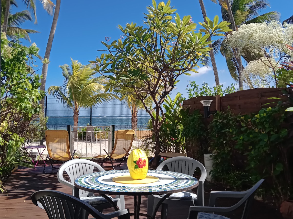 La résidence " Les Touloulous" est une petite résidence les pieds dans l'eau de 14 logements située à Sainte-Anne, face à la mer. L'appartement est un 2 pièces de 51 m² "les pieds dans l'eau", au RDC avec sa terrasse, son jardin tropical, un barbecue et une douche, un accès direct sur la plage de la résidence et au lagon - 1 chambre avec 1 lit "Queen size" (160x200), moustiquaire baldaquin - un séjour avec TV, un 1 lit 90x190 et 1 canapé lit 140x190 - une cuisine tout équipée avec lave-linge