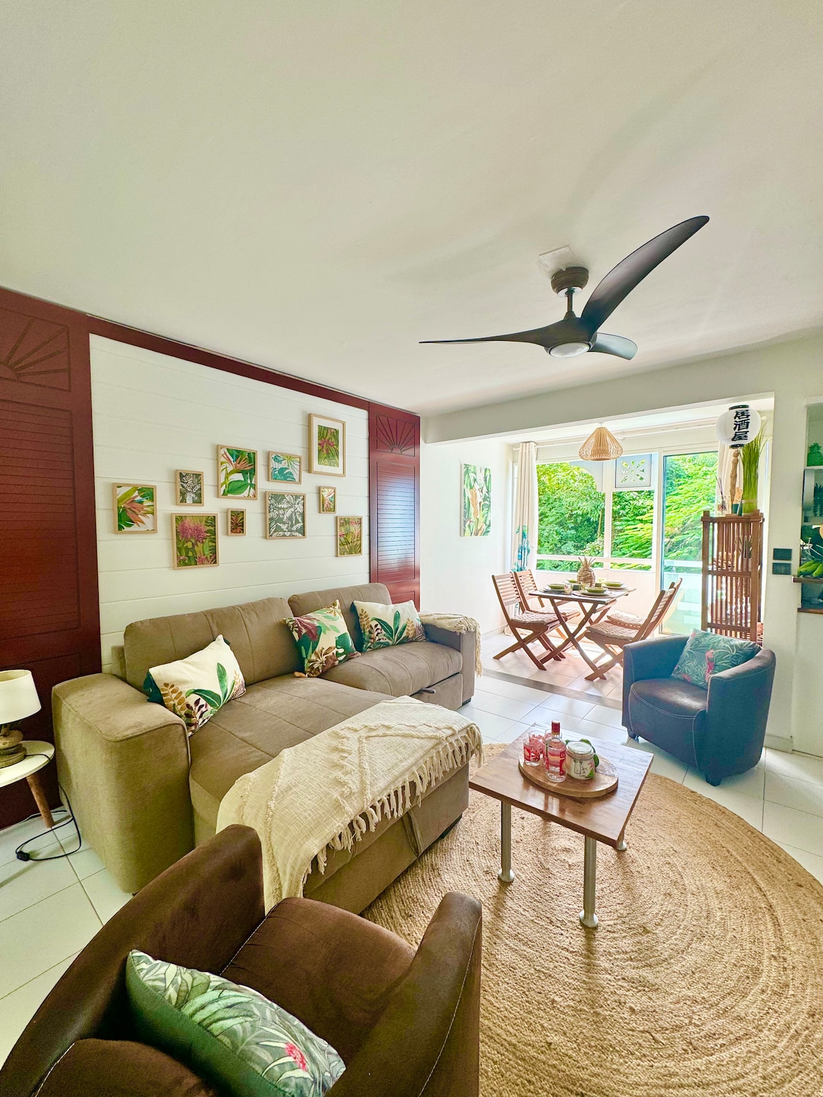 Welcome to your vacation studio, in the heart of a small leafy property just a few steps away from Pointe Marin beach. Freshly refurbished with a natural ambiance, this apartment is perfect for travelers in search of disconnection. For total independence, it has a fully equipped kitchen and a washing machine. Finally, its wooden terrace is ideal for meals to birdsong or to enjoy a cocktail after an exhausting day at the beach.