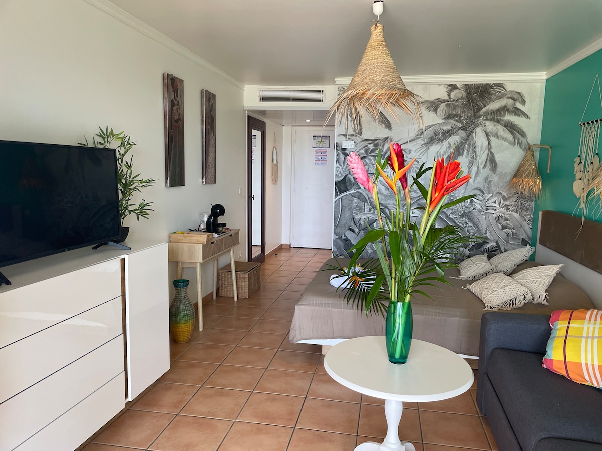 Welcome to your vacation studio, in the heart of a small leafy property just a few steps away from Pointe Marin beach. Freshly refurbished with a natural ambiance, this apartment is perfect for travelers in search of disconnection. For total independence, it has a fully equipped kitchen and a washing machine. Finally, its wooden terrace is ideal for meals to birdsong or to enjoy a cocktail after an exhausting day at the beach.