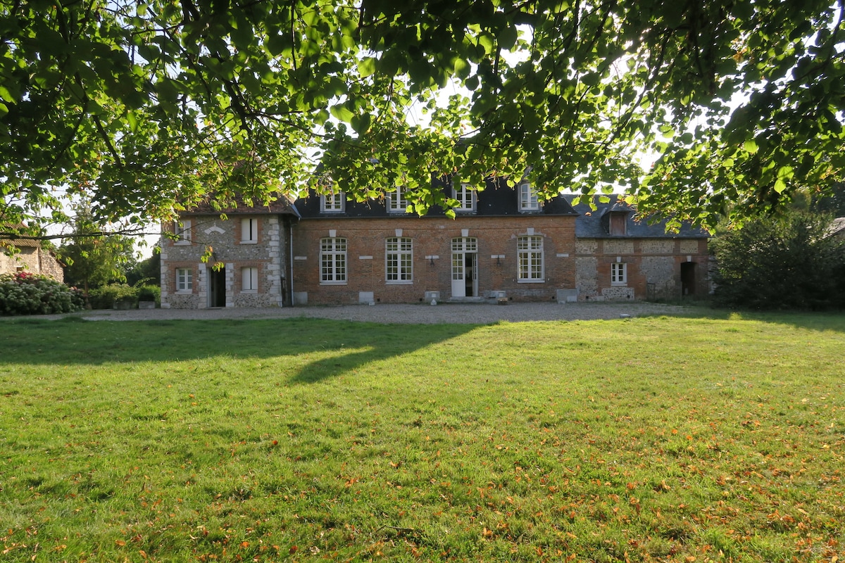 Grande maison dans la campagne Normande, très calme, en bordure des boucles de la Seine, à 20 minutes de Rouen (quartiers historiques) et à 45 minutes de la mer (Veules-les-Roses, Dieppe, Etretat). Au milieu des champs, entourée d'animaux (brebis, ânes, poules). La maison se compose d'un grand salon avec cheminée, d'une grande salle à manger (12 personnes) et d'une cuisine équipée. A l'extérieur, accès libre au grand jardin, à la terrasse (barbecue, mobilier de jardin) et au potager.