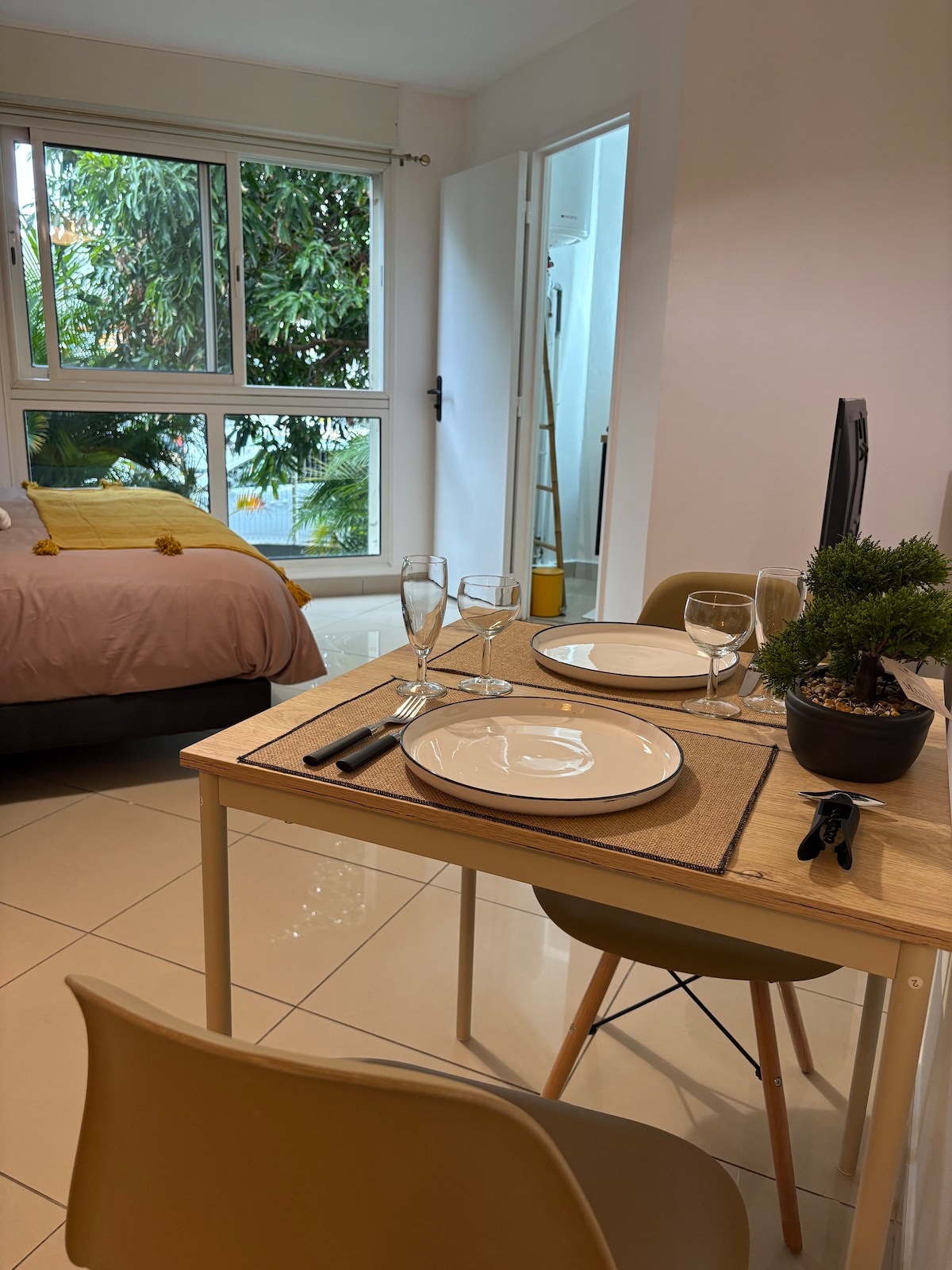 Studio décoré avec goût. Tout sera fait pour rendre votre séjour agréable et confortable (Tous le linge de maison, la vaisselle, de quoi cuisiner). En fin de journée après le travail ou les randonnées vous profiterez d'une piscine bien entrenu. Situation centrale proche de l'aéroport de Saint-Denis et des principaux axes routiers