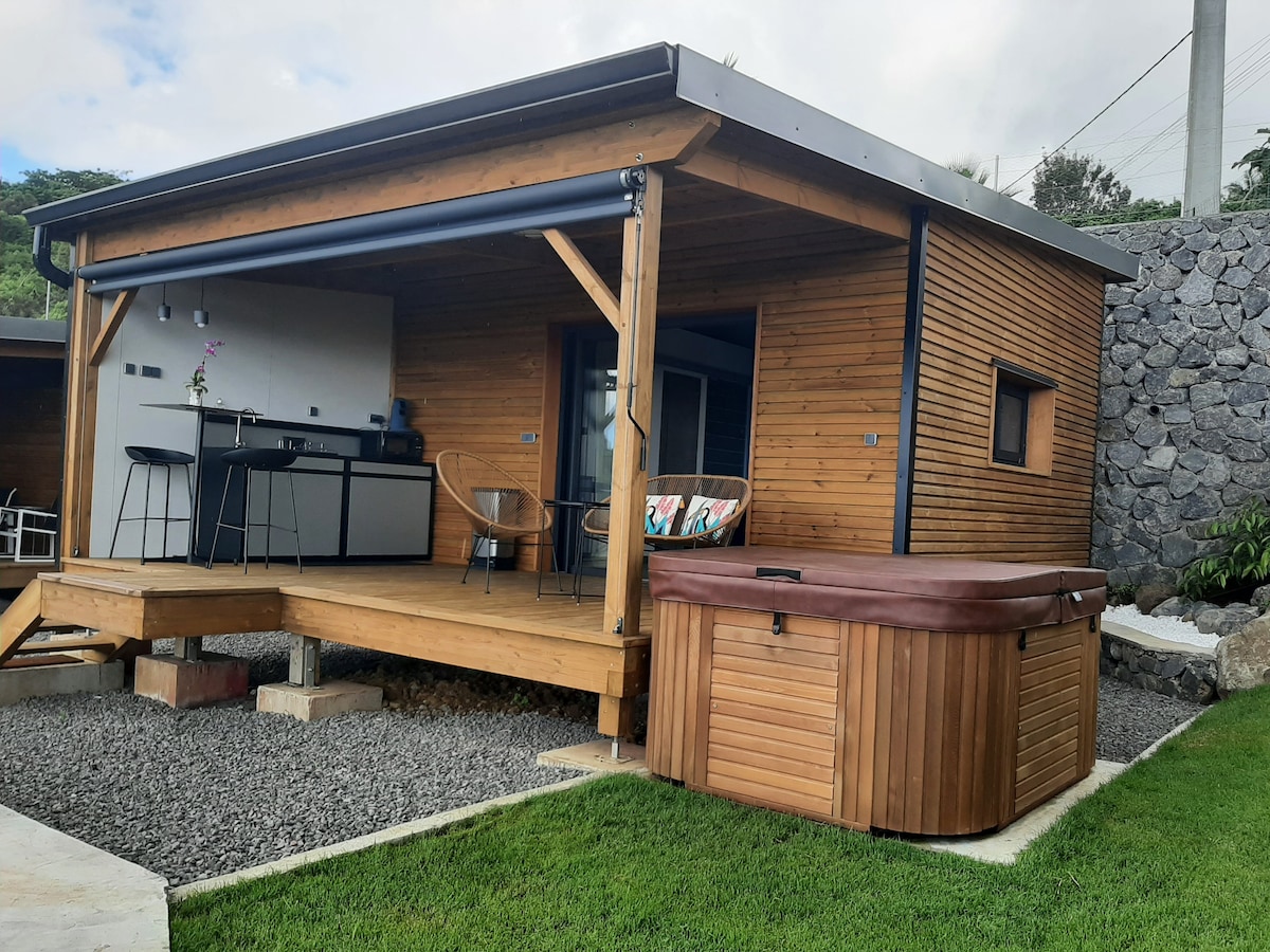 Studio tout équipé climatisé avec cuisine dont machine a café Nespresso, salle de bains avec douche italienne, wc, parking privé, dressing, petit salon, wifi, télévision, 2 terrasses extérieures privées, une à l'entrée à proximité du spa dotée d'un salon et une autre immergée dans la forêt. Vous êtes dans un cocon coupé du monde dans la faune et la flore réunionnaise. Possibilité de garer votre véhicule en toute sécurité dans la cour. Accès au spa complètement privatisé