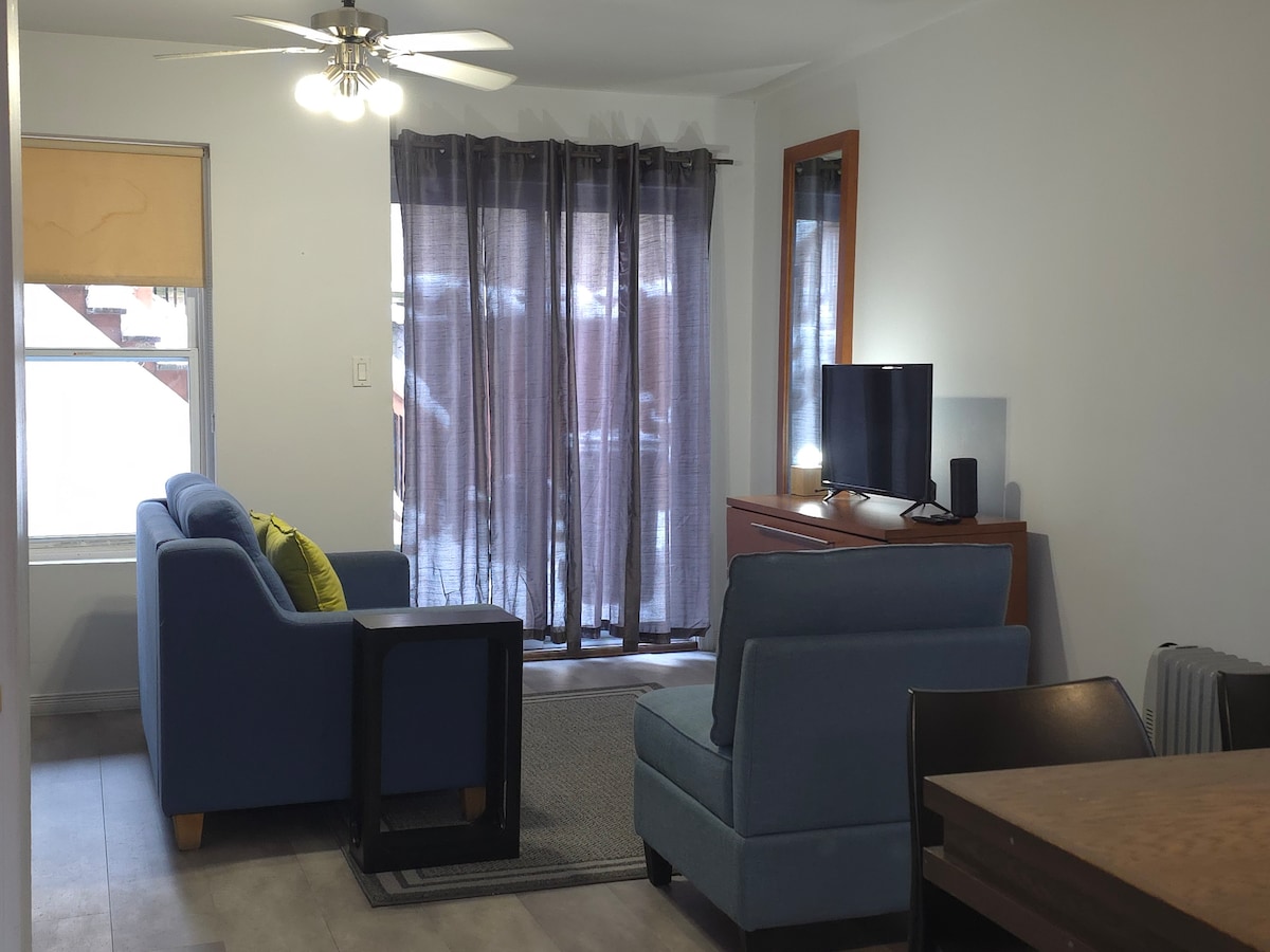 Step into a world of curated comfort. This newly renovated 600-square-foot apartment offers a sophisticated urban retreat. Every detail has been meticulously considered, providing a fully equipped space with all the modern conveniences. Highlights: ✔ Well-equipped kitchen for culinary adventures ✔ Filter coffee machine, Keurig, and Nespresso for coffee lovers ✔ Washer and dryer for added convenience ✔ Flat-screen TV to watch your favourite TV shows ✔ Cosy terrace with outdoor furniture