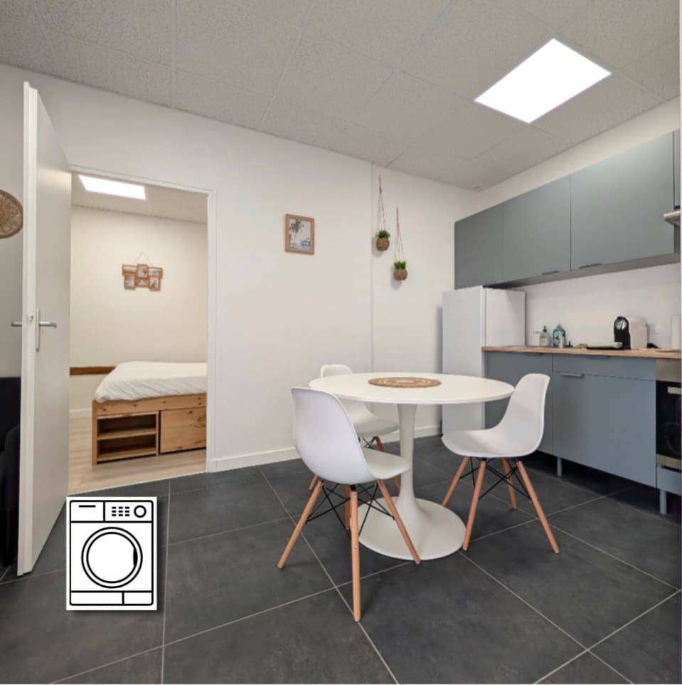 Détendez-vous dans ce logement calme et élégant. Appartement T1 tout équipé situé en rez de jardin d'une maison d'habitation occupée par un couple de jeunes retraités .Ce logement indépendant, neuf, baigné dans un écrin de verdure, situé à 10 minutes à vélo des commerces, à 1500 mètres à pied des plages via la forêt vous séduira par son calme. Vous pourrez découvrir la foret domaniale et son parcours sportif, emprunter les pistes cyclables du littoral directement depuis l'appartement.